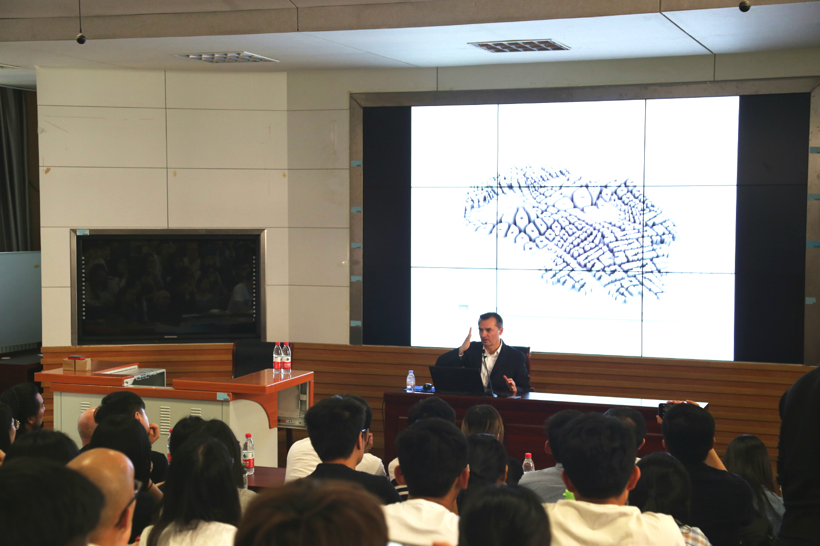 舒马赫教授的讲座主题是建筑设计要基于研究,他主张的参数化建筑设计方法是基于自然环境和人类社会的运行秩序研究的基础上提出的。因此,他认为参数化设计方法并不仅仅是建筑形式的玩弄,而是建立在秩序营造基础之上的方法与理论。他提出,在高度集中的时代和自由市场城市秩序背景下,只有参数化才能使城市秩序与不被限制的市场进程相协调。他通过展示大量的参数化设计支撑下的非线性建筑作品,分析这些建筑的形体灵感来自于自然要素的形体,如湖泊,植物,山石,甚至京剧的脸谱形态和中国传统园林的假山等。因此,自然与人文的秩序都是是参数化设计的理论依据和源泉之一。他认为现代城市不应该只承担庇护人类的作用,还要建立秩序,因为人类社会和生活本身就是秩序的世界。他分析了城市建设中自下而上和自上而下的秩序,提出市场进程应是经济信息进程指导的形式。以市场为基础的城市化是自我改良的,这种自下而上的进化过程存在着多种的竞争与合作,是积极的。而那些试图控制建造环境的自上而下的官僚主义的做法已经不合时宜,所有试图干预自发的城市发展进程的政治企图最终都会失败。只有遵循市场进程与秩序,利用我们复杂和动态的后社会经济,我们才能足够灵活和自适应地去获得潜在的协同效应,并不断地创造出好的建筑与城市。