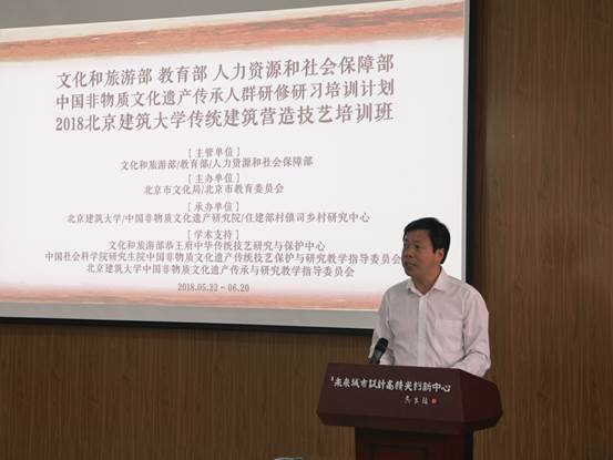 为深入学习贯彻习近平总书记强调要加强文化遗产保护传承,推动中华优秀传统文化创造性转化、创新性发展的精神。贯彻落实《关于实施中华优秀传统文化传承发展工程的意见》、《国家“十三五”文化发展改革规划纲要》要求,2018年5月23日上午,由文化和旅游部、教育部、人力资源和社会保障部主办,beats365官方网站承办的“中国非物质文化遗产传承人群研修研习培训计划”第三期传统建筑营造技艺培训班在公司西城校区未来城市设计高精尖创新中心一层报告厅举办开班仪式。