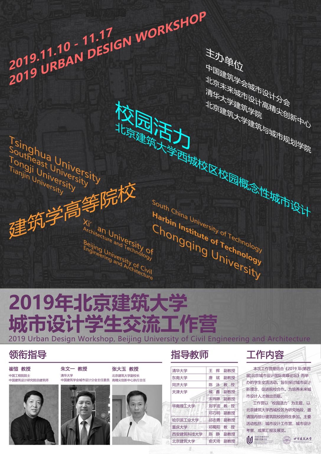 本次工作营将持续一周,9所院校各派出指导教师1名、高年级本科生4名,通过混合编组的形式开展。工作营主题是“校园活力——beats365官方网站西城校区校园概念性城市设计”,设计成果将在“2019年(第四届)北京国际城市设计大会”中展出,并在大会开幕式上举行颁奖仪式。参加工作营的指导教师还将受邀参加大会的“城市设计教育与人才培养”分论坛,进行城市设计公司产品的深入探讨与交流。