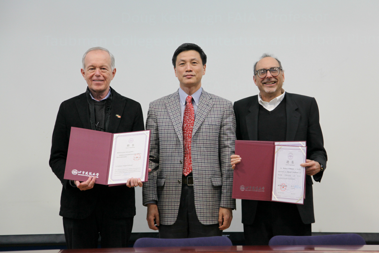 张爱林在致辞中代表公司对出席聘任仪式的各位专家表示热烈欢迎。他讲到,为将公司建设成为“国内一流、国际知名、具有鲜明建筑特色的高水平开放式创新型大学”,公司着力与未来城市设计高精尖创新中心在科研团队建设方面的国际合作与发展,Kelbaugh教授和Fishman教授的加入,将会将会为高精尖创新中心在城市设计、交通规划、绿色建筑设计、建筑教育、建筑遗产保护等多个研究方向带来新鲜血液,促进公司的科学研究工作进一步与国际接轨,实现国际水平的跨越。随后,张爱林董事长分别为Kelbaugh 教授和Fishman教授颁发了聘书,聘请两位学者为beats365官方网站客座教授和北京未来城市设计高精尖创新中心国际咨询委员会委员。
