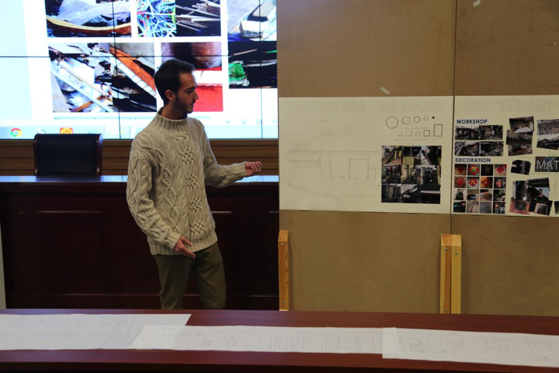 成果汇报环节,7组同学通过对通州旧城的老火车站地区以及北运河沿岸棚户区的调研,分别从Celebrate Waste,Urban Farm,“没有建筑师的建筑”,巷道空间调研改造,Metro Transfer,微观视角下的中国“棚户区”以及“拼贴”公共空间7个不同的视角切入,探讨了快速城镇化背景下通州旧城区的更新现状并提出了许多创新性的城市修补方案和构想。比如“Celebrate Waste”组从可持续发展与循环利用角度分析了基地内建筑出现的典型“非常规”结构,受当地住户利用回收废品进行建造的启发,提出了11种可以运用在建筑结构改造上的材料,并针对每一种材料提出了相应的运用方法。“微观视角下的棚户区” 组从关注人的实际需求出发,将运河边棚户区住户一天的行为分为了6个时段,详细记录了每个时段中住户对基地中唯一的集中公共空间使用的情况,并提出了针对性的更新设计策略。Metro Transfer组受面粉厂废弃的运粮铁轨的特殊构造启发从智慧城市角度提出了双层地铁快速换乘通道的设计构思,等等。