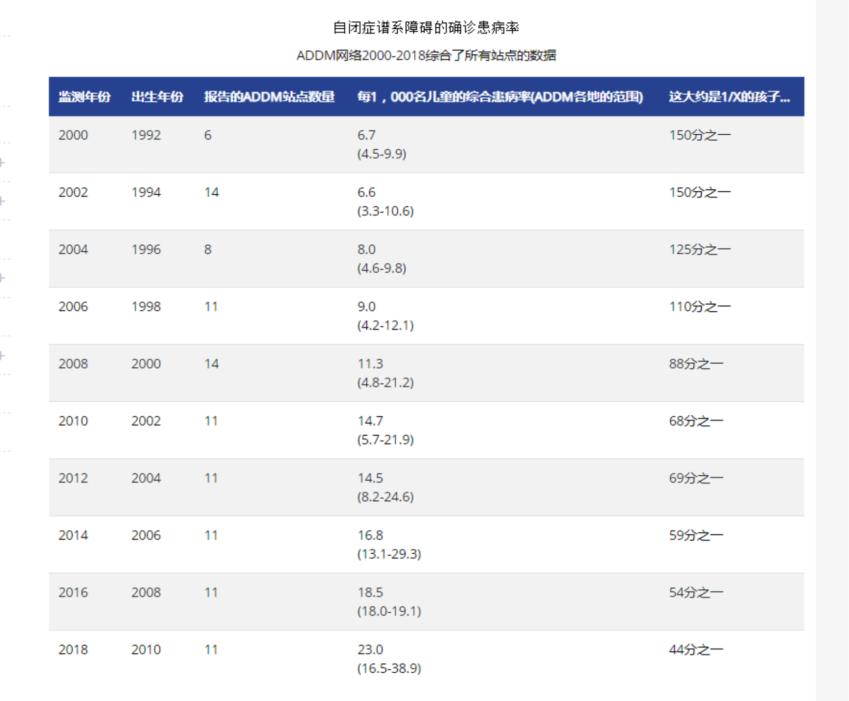 根据美国疾病控制与预防中心(CDC)发病率和死亡率周报(MMWR)发布报告显示, 2018年的统计数据分析,每44名8岁儿童中就有一名(2.3%)被确认患有自闭症谱系障碍(ASD)。