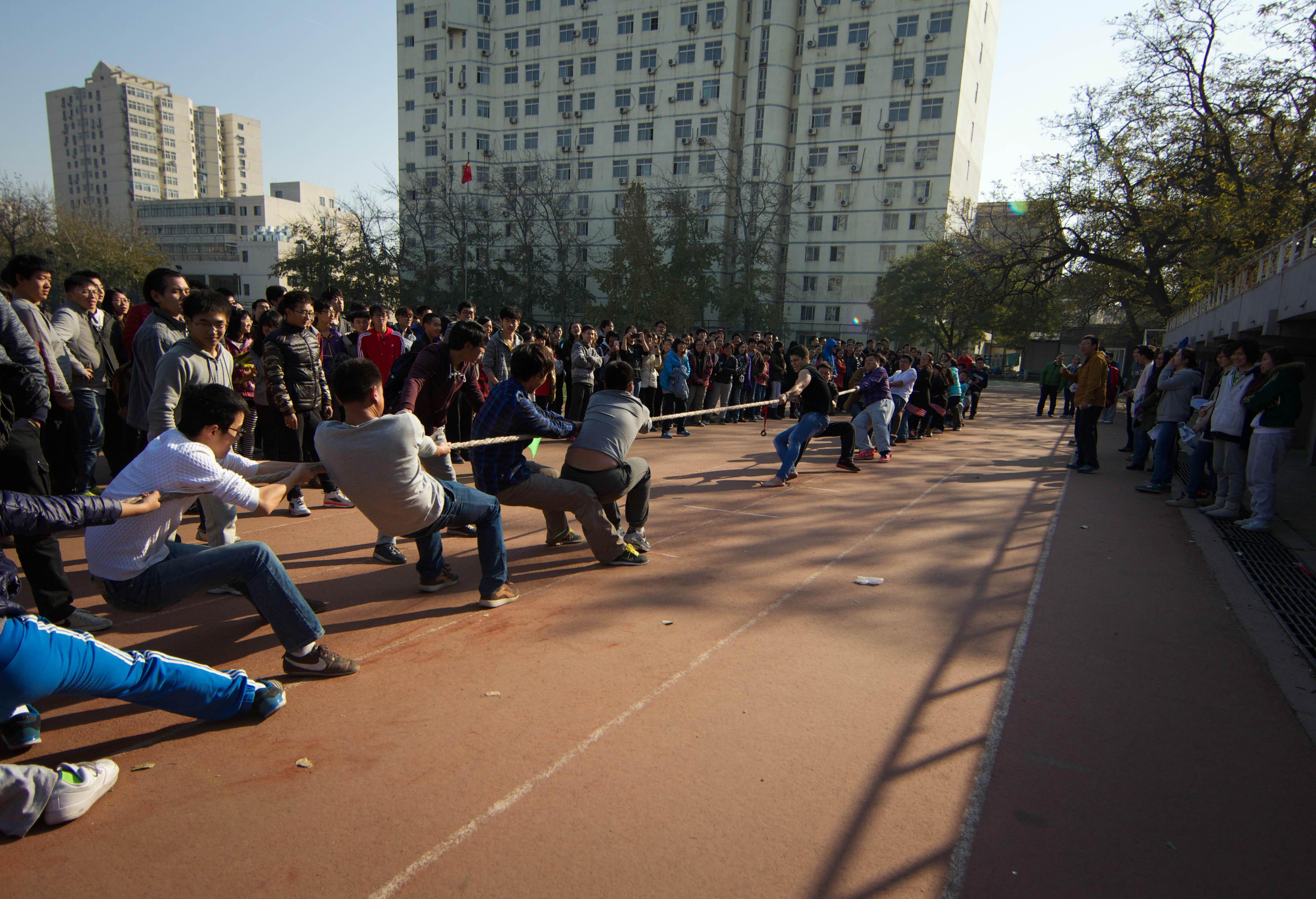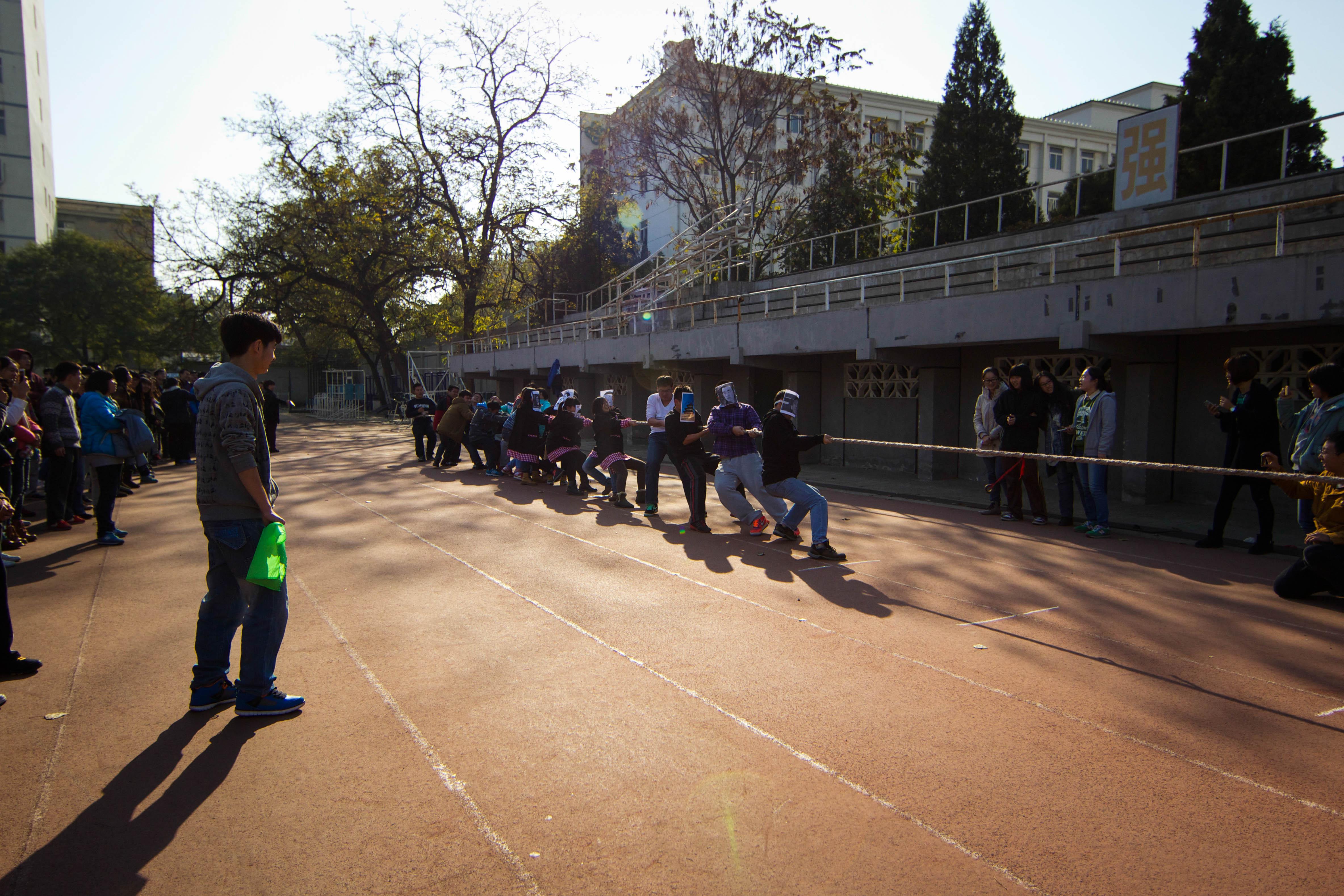 拔河比赛的规则为每队派出20名选手,10男10女,抽签分组决定比赛顺序。比赛的哨声吹响,场上的同学们全都双手紧握绳子,脚靠脚,人挨人,铆足力气向后拉。有的队伍甚至精心准备了搞笑的面具和服装,想在心理上战胜对手,从而取胜。场下的同学们也积极参与,有的为自己的班级加油呐喊,有的高呼着“一二,一二”为他们统一用力的节奏……整个场面激烈而又温暖。