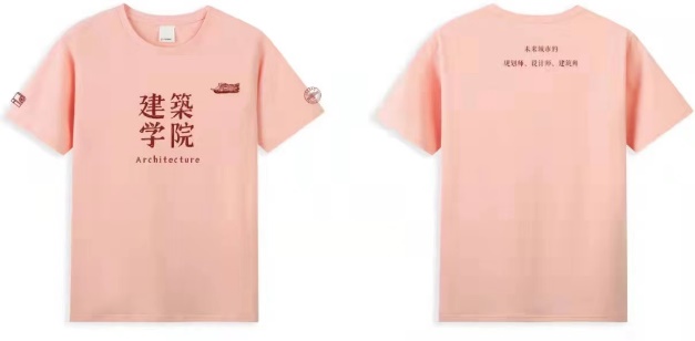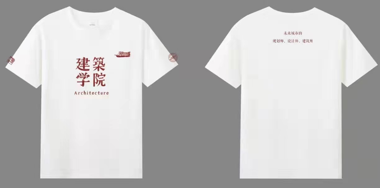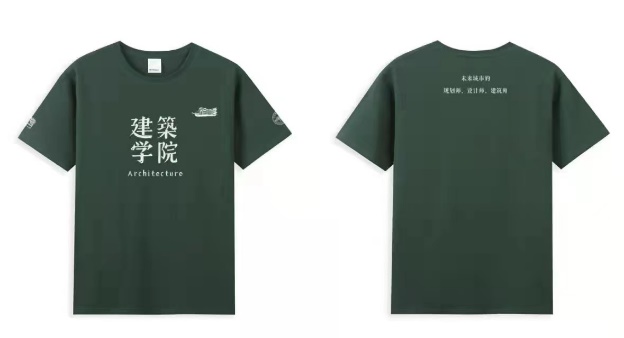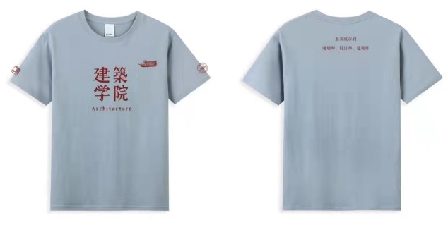 胸前采用正方形构图,端庄有力,建筑公司的字样上有些许斑驳,体现了公司悠久的历史和坚实的文化底蕴。两侧袖标分别为校徽和建筑公司院徽,颇具纪念意义。背后的文字“未来城市的规划师、设计师、建筑师”体现了公司对毕业生的祝福与实力的肯定。