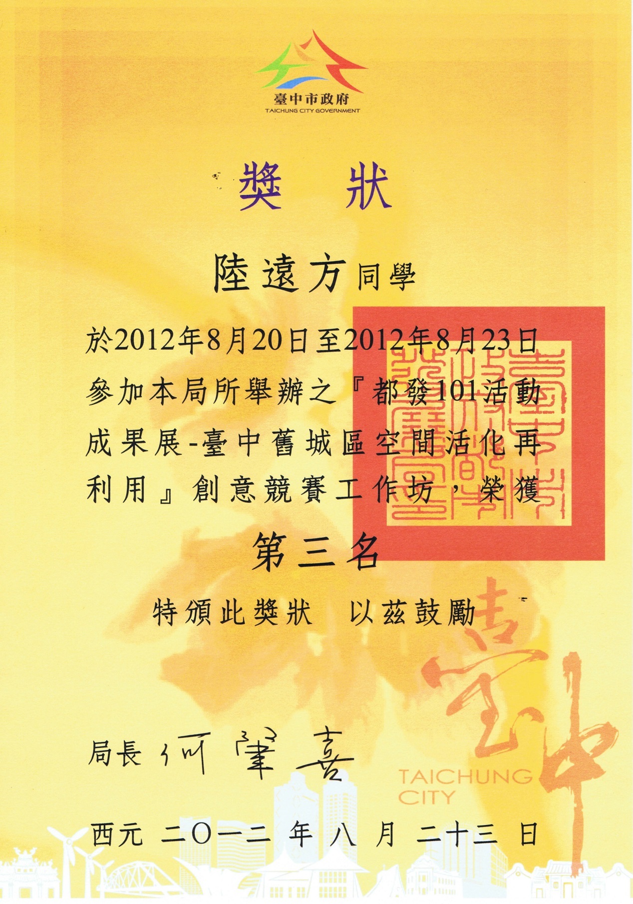 201337日由台中市都市发展局和台湾景观环境学会举办的“都发101海峡两岸旧城区空间活化”创意竞赛暨论坛中,由公司丁奇老师、蔡宗瀚老师、牛磊老师及陈栋老师指导的由王洁新、杨珊珊、于丁、屈辰、陆远方、王哲等风景园林、城市规划、建筑学多专业研究生及本科生组成的设计团队作品《脉点》获得了本次竞赛优胜奖(第3名),奖金1万元新台币。