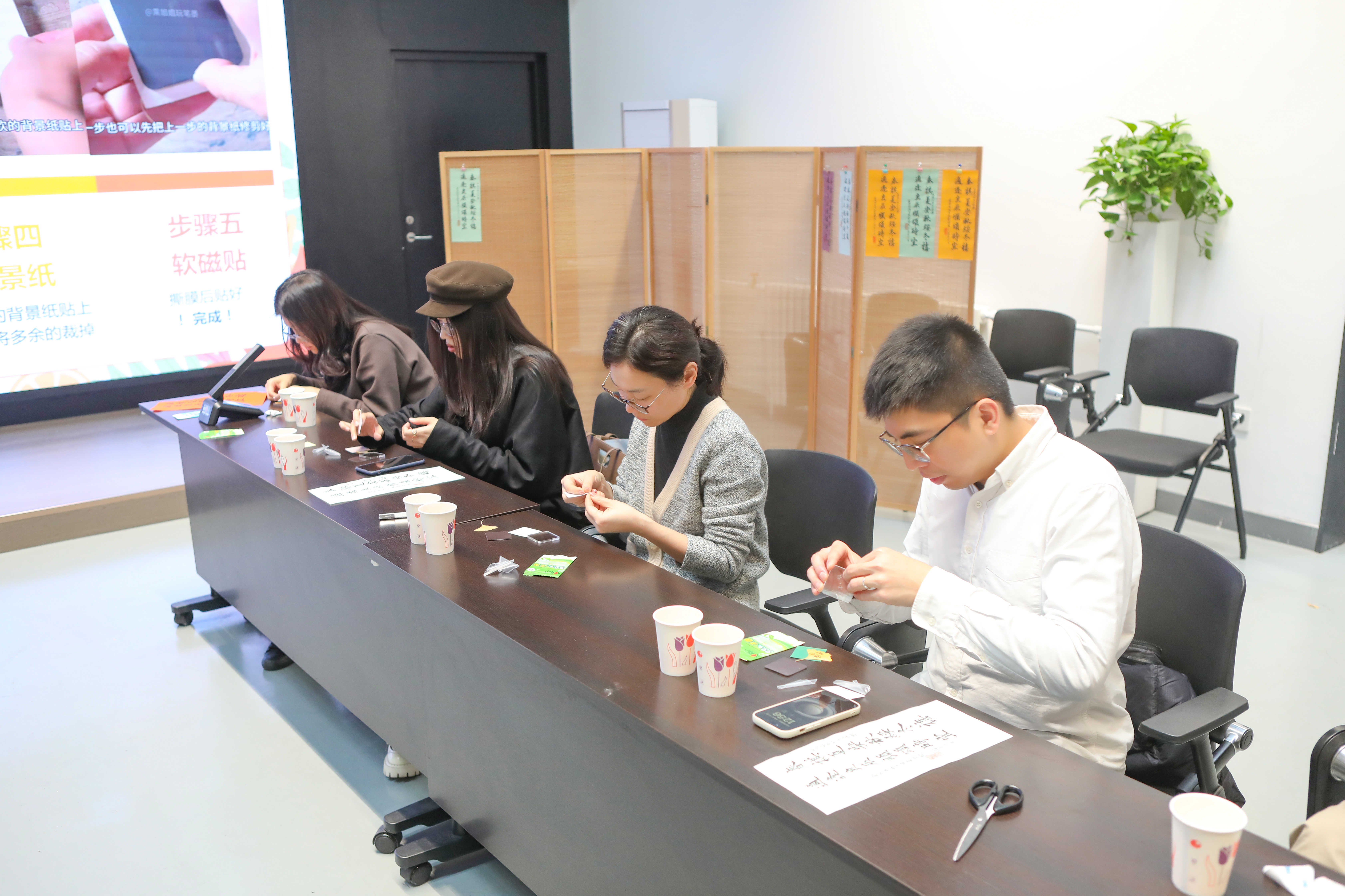 祝福仪式之后,我们迎来了生日会的特别环节——银杏叶冰箱贴制作。何立新书记、书法社员工成员在银杏叶上书写了对老师们的祝福。这一活动让老师们通过日常随手可得的材料,留住秋日浪漫,拥抱美好生活。大家在动手实践的过程中感受到手工制作的魅力和创造的乐趣,在心灵手作中度过了一个愉快的中午。