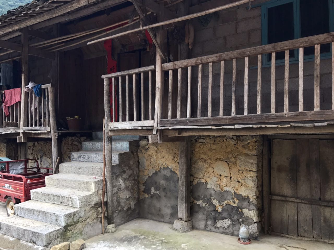 随后,团员们跟随韦主任和韦董事长入村进行走访,村中目前现存两幢完整的干栏式民居。建筑共分两层,其中二层用木柱从地面架起,两层之间用木板分隔。建筑左右对称,建筑中间楼梯的楼梯通向入户门,楼梯两侧分别为牛圈和米仓。楼梯建造考究,青色的石阶上刻有纹样和“福”字。自家女儿长大后,父母会在女儿闺房的木门上凿穿直径约为一公分的小洞,称为“谈婚洞”。到了晚上,青年男子会来这里通过这个小洞和心仪的姑娘聊天,用吹笛子、拉二胡等才艺来感动女方。这种习俗在当地称为“凿壁谈婚”。随着社会的不断发展,传统的民居建筑以及附属其中的传统文化已在逐渐消失,这一现状也引发了实践团成员对传统村落以及传统建筑保护及其利用形式的思考。