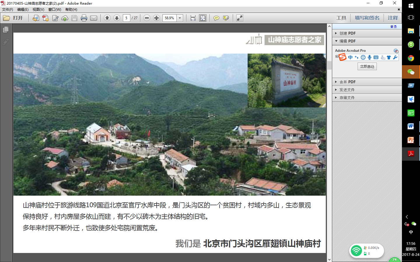 为了更好的聚焦农村建设,引导低收入村提升文化内涵,让员工能够发挥专业所长,研究当地特色文化。2017年7月,建筑公司联合公司党委宣传部,赴延庆区井庄镇开展了为期两周的“秀美乡村,成风化人”社会实践活动。团队成员走进基层,走进群众,先后走访了胡家营村、柳沟村、王仲营村、艾官营村等多个传统村落,结合当地民俗旅游发展状况,在村内进行了走访调研,了解村庄的历史故事和发展状况以及文化和设施建设,并通过宣讲的形式向村内居民进行反馈。本次调研活动与延庆区委宣传部构建“大家做宣传、对大家做宣传、把宣传工作做大”的大宣传格局相呼应,利用文化与创新思维结合的有效方式,传播村落优秀文化,探索弘扬社会主义核心价值观。
