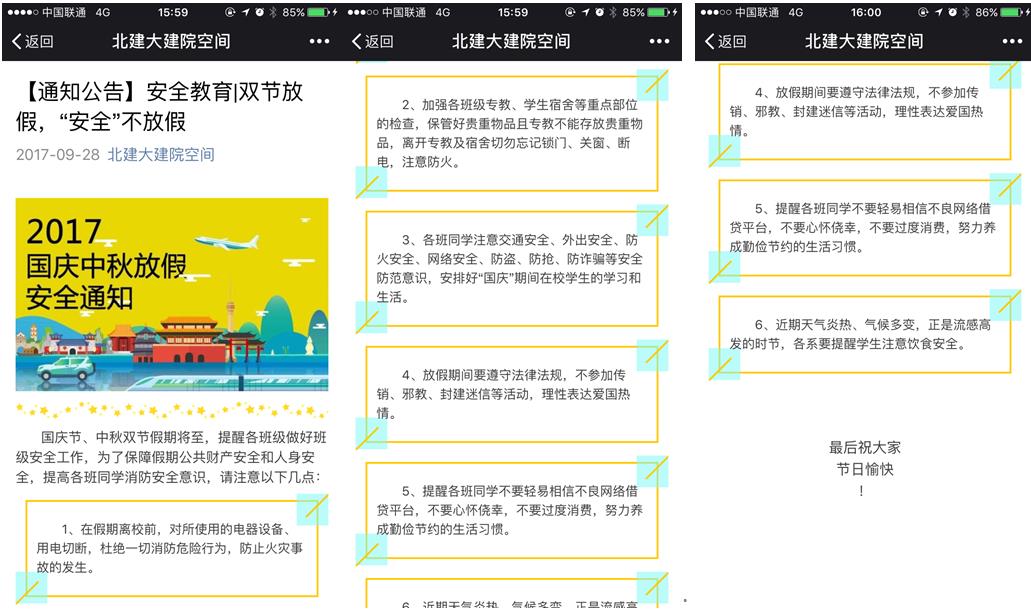 此外,建筑公司学工召开学工安全工作会,并向各年级下发国庆中秋双节安全通知,提醒同学们在“双节”期间有出行计划的同学合理安排行程。个人出行前将行程告知本班班长备案,如果班级集体出行需提前告知年级辅导员和班级导师备案。出行期间购买保险,增强安全意识,注意防范意外,按时返校。留在公司的同学须遵守公司规定,加强防火防盗意识,合理安排假期时间,切实保障同学们在假期间的人身和财产安全。
