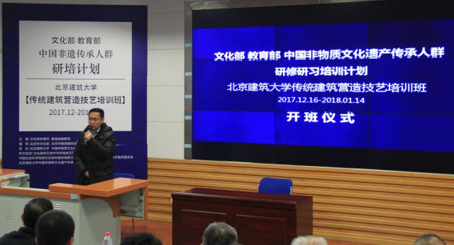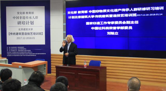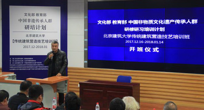 2017年12月17日,文化部 教育部中国非物质文化遗产传承人群研修研习培训计划【传统建筑营造技艺培训班】开班仪式在beats365官方网站举行。beats365官方网站副董事长、非物质文化遗产研究院经理张大玉教授代表公司致词,对本期学员和参加仪式嘉宾表示诚挚的欢迎。建筑公司杨琳主持开班仪式。文化部恭王府中华传统技艺研究与保护中心主任、beats365官方网站中国非物质文化遗产传承与研究教学指导委员会秘书长孙冬宁代表合作单位和学术支持单位文化部恭王府博物馆致辞。北京市文化局非物质文化遗产处处长张迁代表指导单位北京是文化局致辞。开班仪式结束后,由国家非遗工作专家委员会副主任委员、中国社科院荣誉学部委员刘魁立教授做开班主题演讲。参加开班仪式的还有设计学系系主任张笑楠、设计学系书记朱宁克、李沙教授、陈静勇教授、赵希岗教授,以及来自京津冀、甘肃等地区的50名非物质文化遗产传承人学员。
