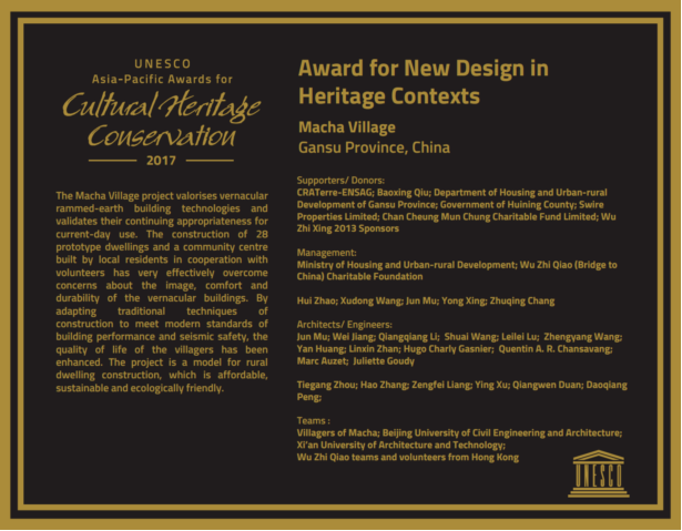 “文化遗产保护”系列奖项是由联合国教科文组织于2000年设立,旨在表彰为保护具有历史价值的建筑、保护并传承传统文化遗产、发扬地域文化价值等方面做出贡献的组织或个人。马岔村现代夯土农宅示范与推广项目从来自亚太地区的43个入围项目中脱颖而出,与江西景德镇陶瓷工业遗产博物馆同时获得了文化遗产保护创新设计奖。评审团颁奖评语指出:“通过改良传统建造技术以满足今天的房屋安全与性能要求,该项目不仅使村民的居住生活品质得到有效地提升,而且成功诠释了一个经济适用、生态环保且可持续的农村房屋建设模式。”