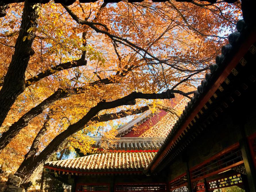 从东门进去,入眼就是仁寿殿,殿前伫立着铜龙铜凤,蹲坐在庭院中央的铜麒麟、龙头、师尾、鹿角、牛蹄,前人赋予了它通灵的神性、睥睨的王性,虽然人声鼎沸,却也使人倍感威严。绕过仁寿殿,是一条深幽小径,不禁想起《桃花源记》,“林尽水源,便得一山,山有小口,仿佛若有光。便舍船,从口入。初极狭,才通人。”的确有一番韵味,假山缝中的小径,你不知道前面是什么,却又想一探究竟。“复行数十步,豁然开朗”,踏进小径,转过一个弯,入眼的是与之前庄重肃穆全然不同的开阔。