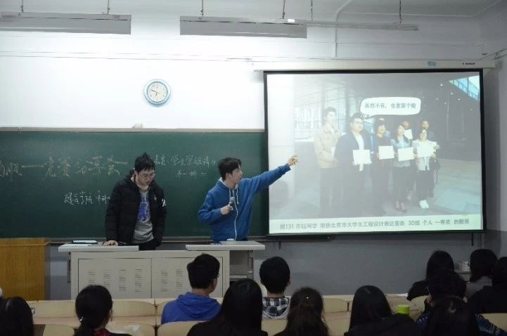 随后,李岳宸、王楚文同学向大家介绍了参加北京市老员工工程设计表达竞赛获得创新设计个人二等奖的经历。