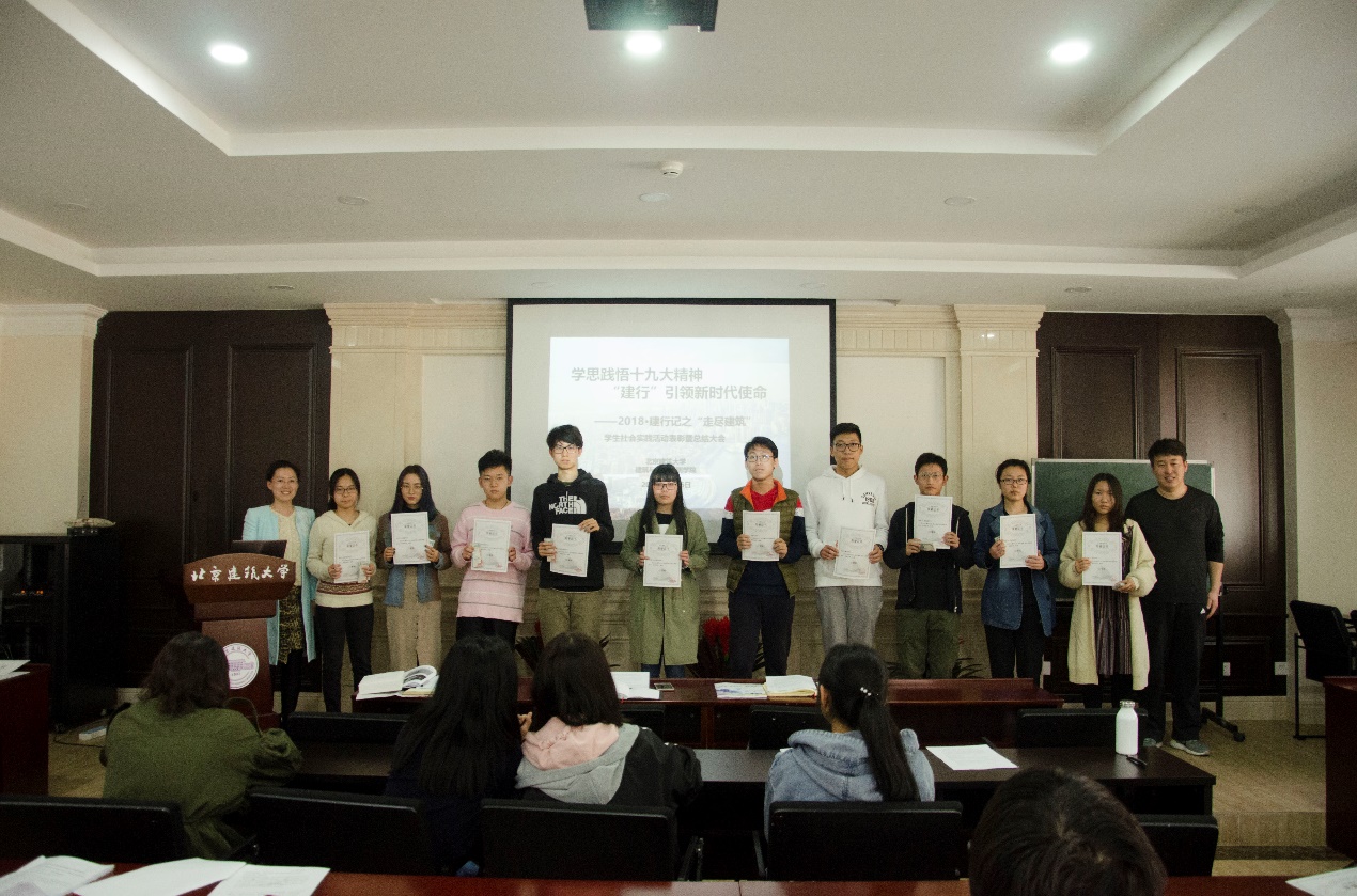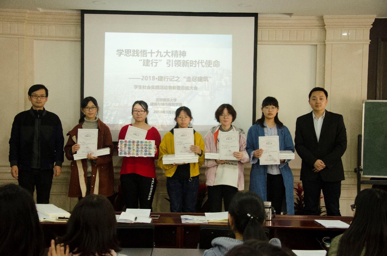 至3月底,2018·建行记之“走尽建筑”员工社会实践活动进入尾声。3月26日下午14:50,在西城校区教1-126报告厅,举办了2018·建行记之“走尽建筑”社会实践活动表彰暨总结大会。校宣传部部长孙冬梅、校团委副书记卫巍、校宣传部副部长孙强、建筑公司党委副书记王秉楠、校宣传部及建筑公司的各位老师,以及2017级所有获奖员工、员工干部共计60余名师生共同参加。此次表彰暨总结大会,由建筑公司2017级本科生辅导员代云主持。