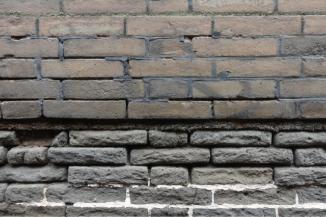 在传统村落的建筑墙面防潮做法中,最常见的方式是苇碱,基部常加入一层芦苇杆,两端用斜切面木板进行固定,墙里面垒坯,墙外用青灰勾砖缝。从图片中可以明显看出,芦苇杆以下的黏土砖腐蚀严重,以上的黏土砖保存完好。原理在于,潮气沿着芦苇杆的空心排出,可以防止潮气上升,腐蚀黏土砖。