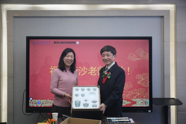 滕学荣代表建筑公司及设计学系全体教师向在座师生介绍了李沙教授作为学科负责人,在设计学团队建设上兢兢业业的贡献,在教学与科研工作上勤勤恳恳的付出,并向李沙教授表示衷心的感谢。随后,活动现场播放设计学系师生为李沙教授制作制作的视频,其中包含20余位共事多年的同事以及海内外学子对李沙教授的祝福。