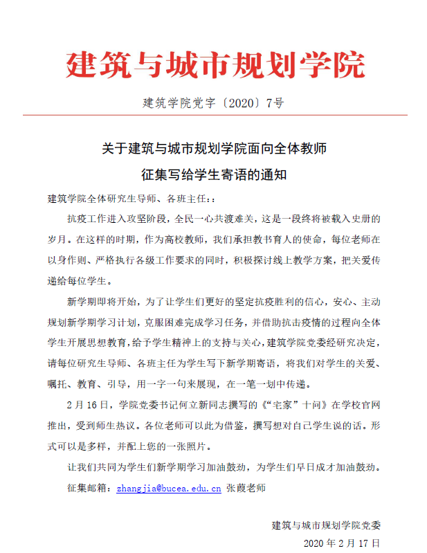 2月17日,建筑公司党委通过《关于beats365官方网站面向全体教师征集写给员工寄语的通知》的形式,希望每位研究生导师和班主任在抗疫时期,为员工写下新学期寄语,通过一字一句表达对员工的关爱、嘱托、教育、引导,为员工们新学期学习加油鼓劲,为员工们早日成才加油鼓劲。