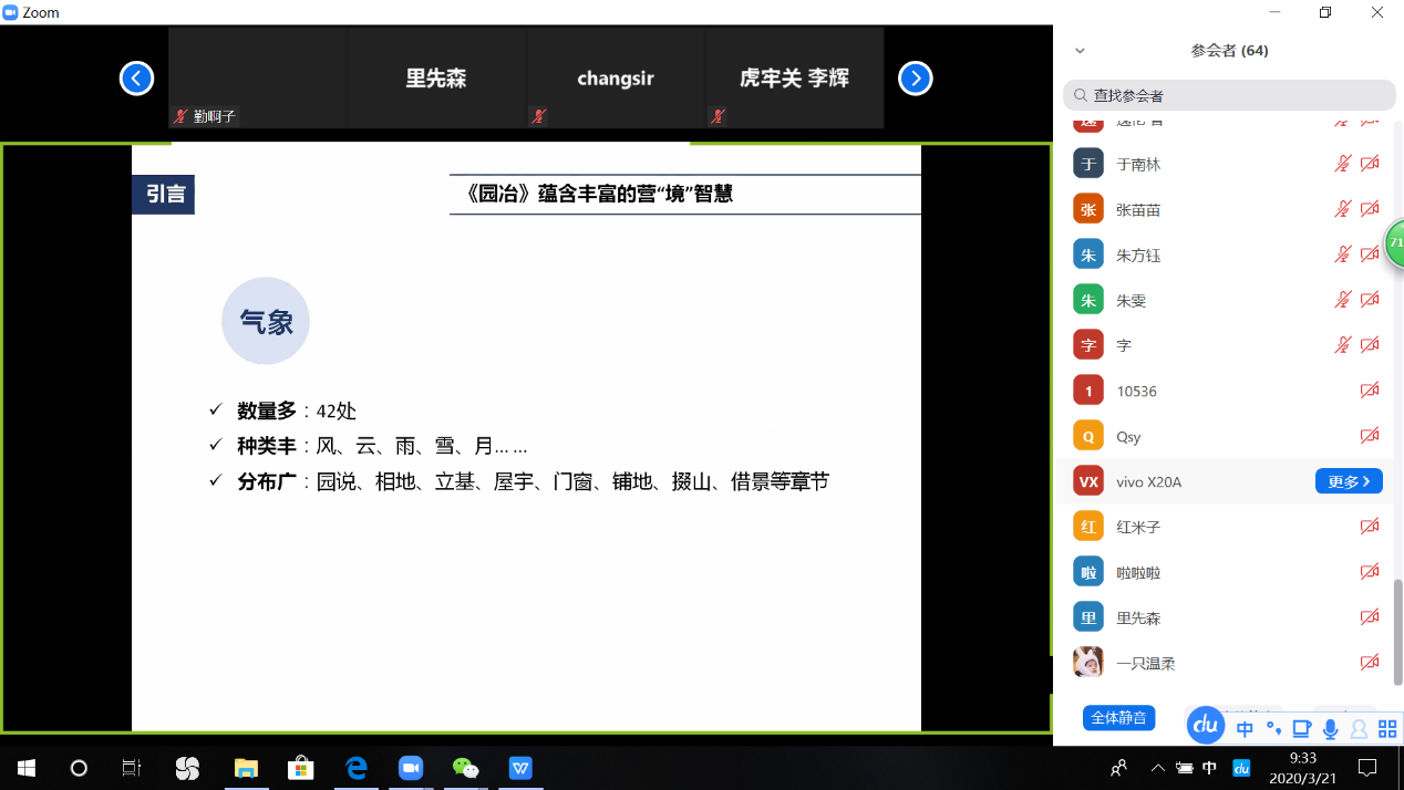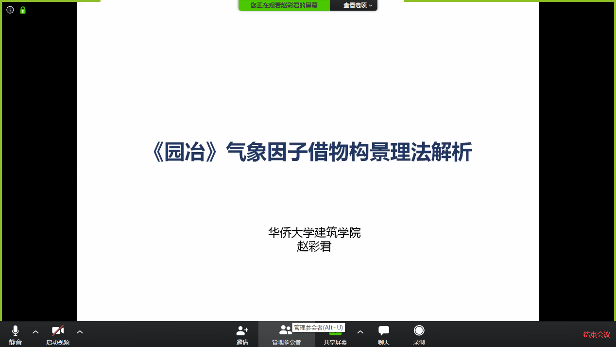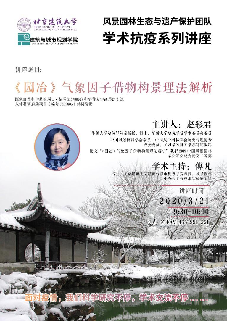 3月21日上午,华侨大学建筑公司赵彩君副教授应邀在Zoom平台上与大家分享了以“《园冶》气象因子借物构景理法解析”为主题的讲座,公司师生和校外学者共80余人参与了本次线上学术交流活动。赵老师从《园冶》中蕴含的丰富的营“境”智慧谈起,通过梳理“境”的组成要素发现,气象因子是其中出现频率较高,且极富特色的组成部分之一。但由于它的虚幻性、多变性和速变性等特征,气象因子在营“境”过程中往往通过借物构景,与物质性构景要素共同构成园林虚实、动静、变换之美;随后,从自然和文化两个角度,解析了气象因子借山水、建筑、植物、动物、器具和活动构景的理法,最后,提出气象因子在营“境”中的功能,包括交代时间、烘托场景、人境交互、打造意境等。