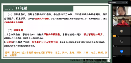 其次,由研究生辅导员成慧祯老师为大家分享建筑公司就业进展,内容主要包括介绍2020届就业进展、疫情下的就业政策及户口政策(具体涉及2020年就业政策的新变化、户口政策变化、非全日制以及定向生的就业说明等)以及根据员工咨询较多的线上招聘与签约流程进行解答等(包括线上招聘解析、拓宽就业渠道、线上签约流程、就业咨询渠道等)。