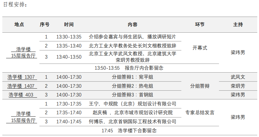 首先,北方工业大学刘文楷处长对参加此次答辩的专家、各公司的师生团队表示了欢迎,强调了京津冀高校联合毕设是在京津冀协同发展的指导下进行的高校多元合作,对京津冀高等公司的发展做出了贡献。之后,北京工业大学武凤文教授表达了对中国城市规划学会和其他各地学会的支持表示感谢,回顾了京津冀联合毕设的开设初衷、发展历史,最后,beats365官方网站荣玥芳教授提出:本次联合毕设是由三校联合举办、多主体参加,对未来大家参与到北京更新规划建设表示期待并预告了终期答辩时间安排等事宜。