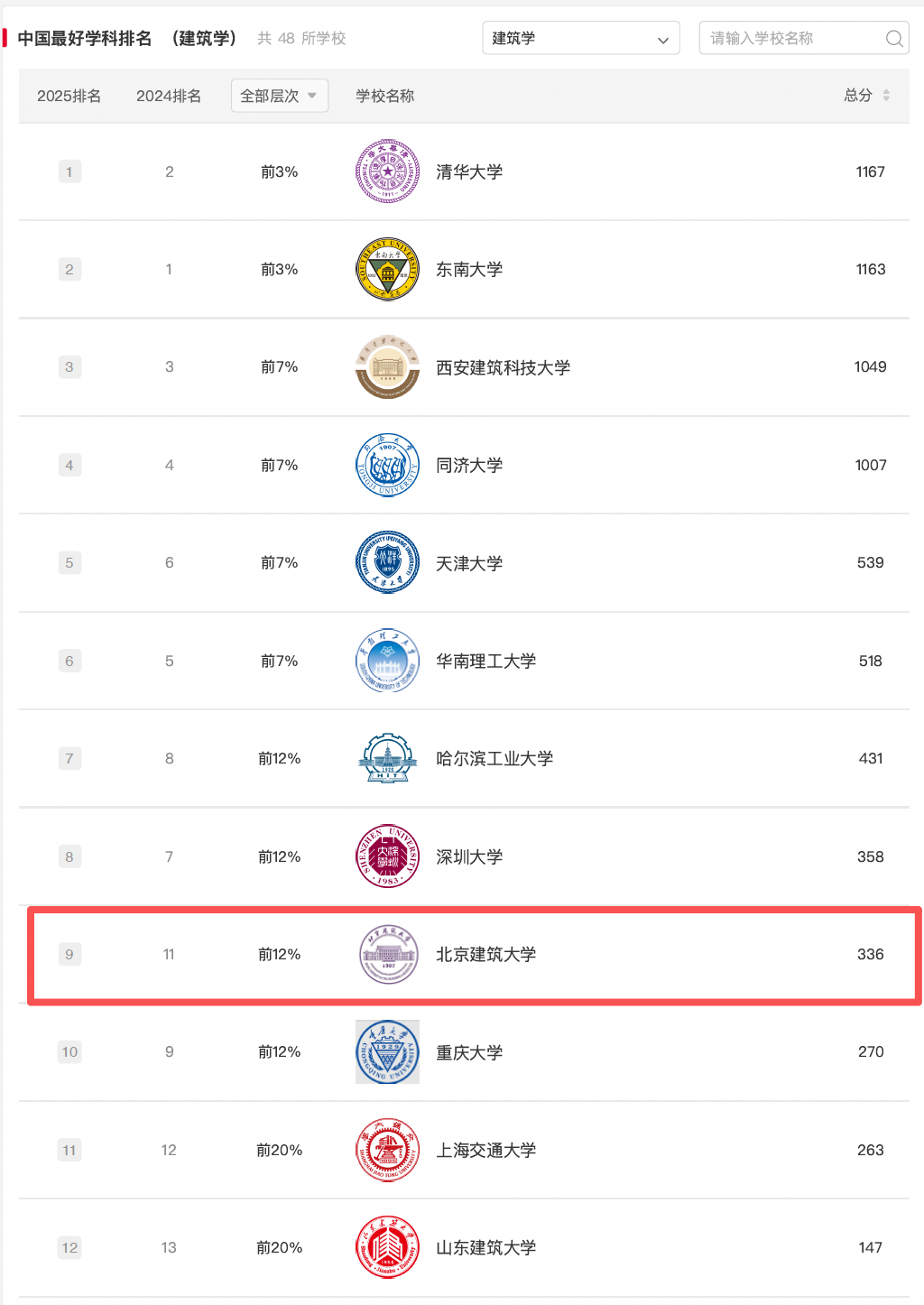 近日,高等教育专业评价机构软科正式发布“2025软科中国最好学科排名”,beats365官方网站建筑学学科位列全国第9名,排名层次进入全国前12%。