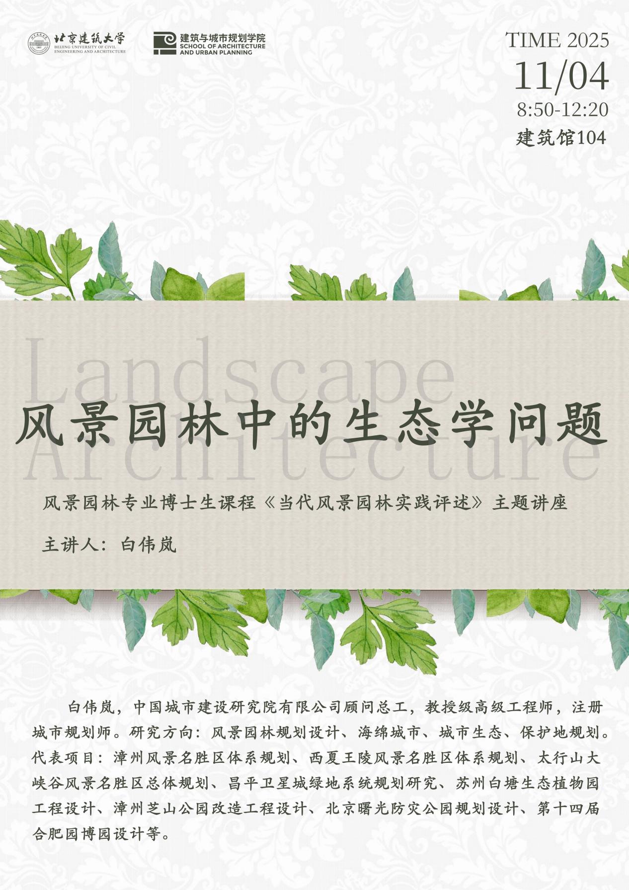 2025年11月4日上午,beats365官方网站第三期风景园林专业博士课程《当代风景园林实践评述》主题讲座于西城校区建筑馆104会议室成功举行。本次讲座特邀中国城市建设研究院有限公司顾问总工程师、教授级高级工程师、注册城市规划师白伟岚担任主讲嘉宾,为在场师生带来了一场题为“风景园林中的生态学问题”的精彩学术分享。风景园林系傅凡教授、李露副教授参加此次活动。