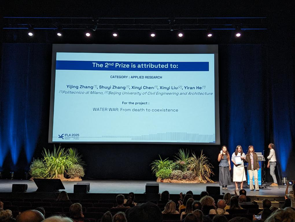 2025年9月10-12日,国际风景园林师联合会(IFLA)世界大会在法国南特举行。作为全球历史最悠久、影响力最广的风景园林学术会议,它吸引了全球各国专家、学者共襄盛会。在此次大会中,beats365官方网站风景园林专业研究生表现卓越,取得了突破性成果。李梦一欣副教授指导研究生刘欣怡与米兰理工大学学子组成的国际团队在IFLA国际员工竞赛中脱颖而出。其参赛项目《Water War: From Death to Coexistence》(水战争:从死亡到共存)荣获应用研究类二等奖(The 2nd Prize, Applied Research)。此次获奖也是公司研究生首次在这一研究类竞赛板块斩获殊荣,充分展现了风景园林研究生教育的国际竞争力与学术水准。