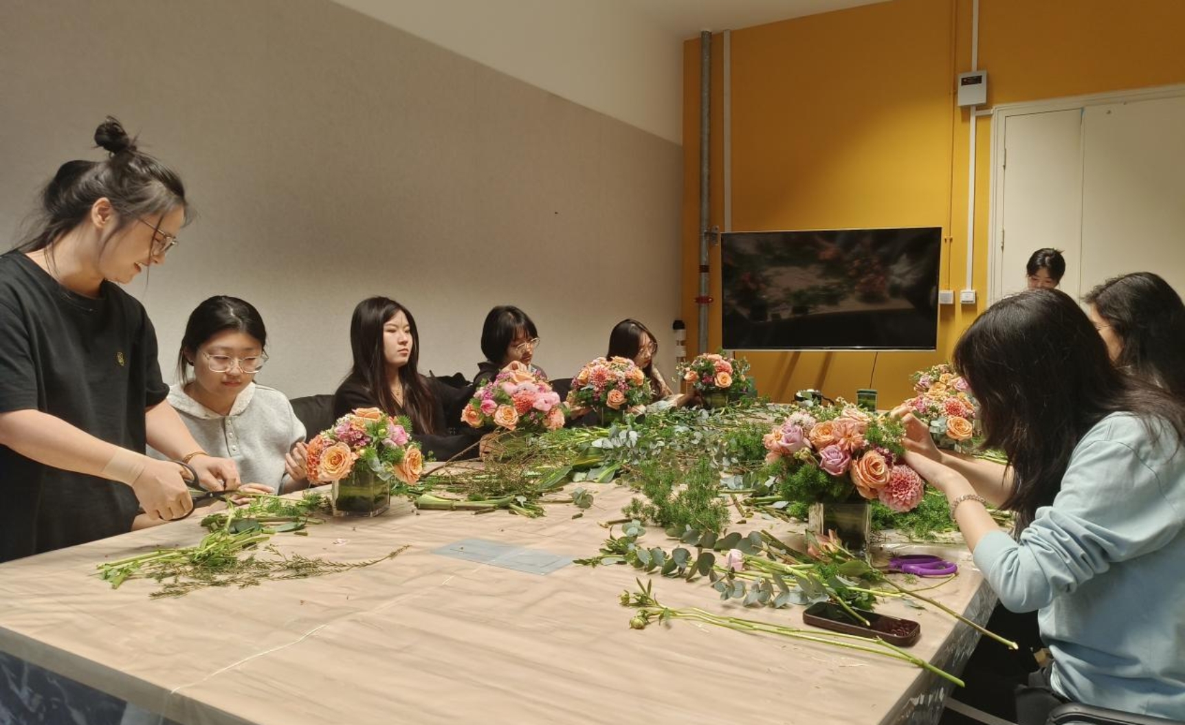 花艺师李浩程带来《方寸造物:艺术盆栽启蒙课》,从植物选型、器皿搭配到构图设计,将盆栽设计中的空间布局、生态适配等学术思考融入创作中。樊莉莉老师的《指尖花语・插花初体验》课程围绕插花的基础手法、色彩搭配原则、不同场景下的插花风格等内容展开教学。同学们在色彩搭配、造型推敲中融入个人学术见解,将插花艺术转化为空间艺术装置的灵感源泉,一束束精致的手捧花与桌花作品,成为研究生创新实践的具象呈现。