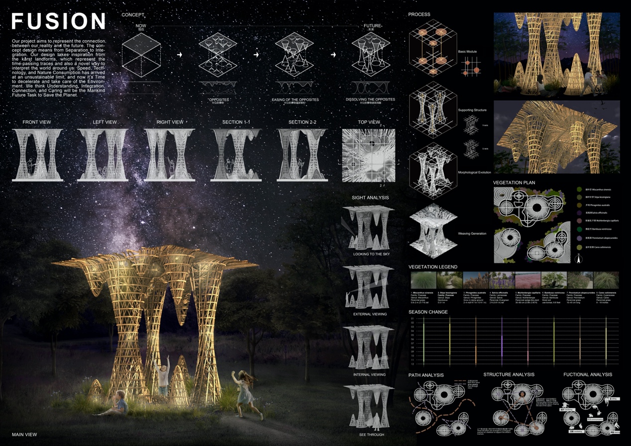 在竞赛方案设计过程中,团队探索多学科多校国际联合竞赛的教学模式与理念,克服了疫情期间无法开展线下国际合作的困难与挑战;确定了竹类构造教学在北建大实践教学课程体系中的位序与作用。最终,圆满地完成了方案设计与模拟建造。