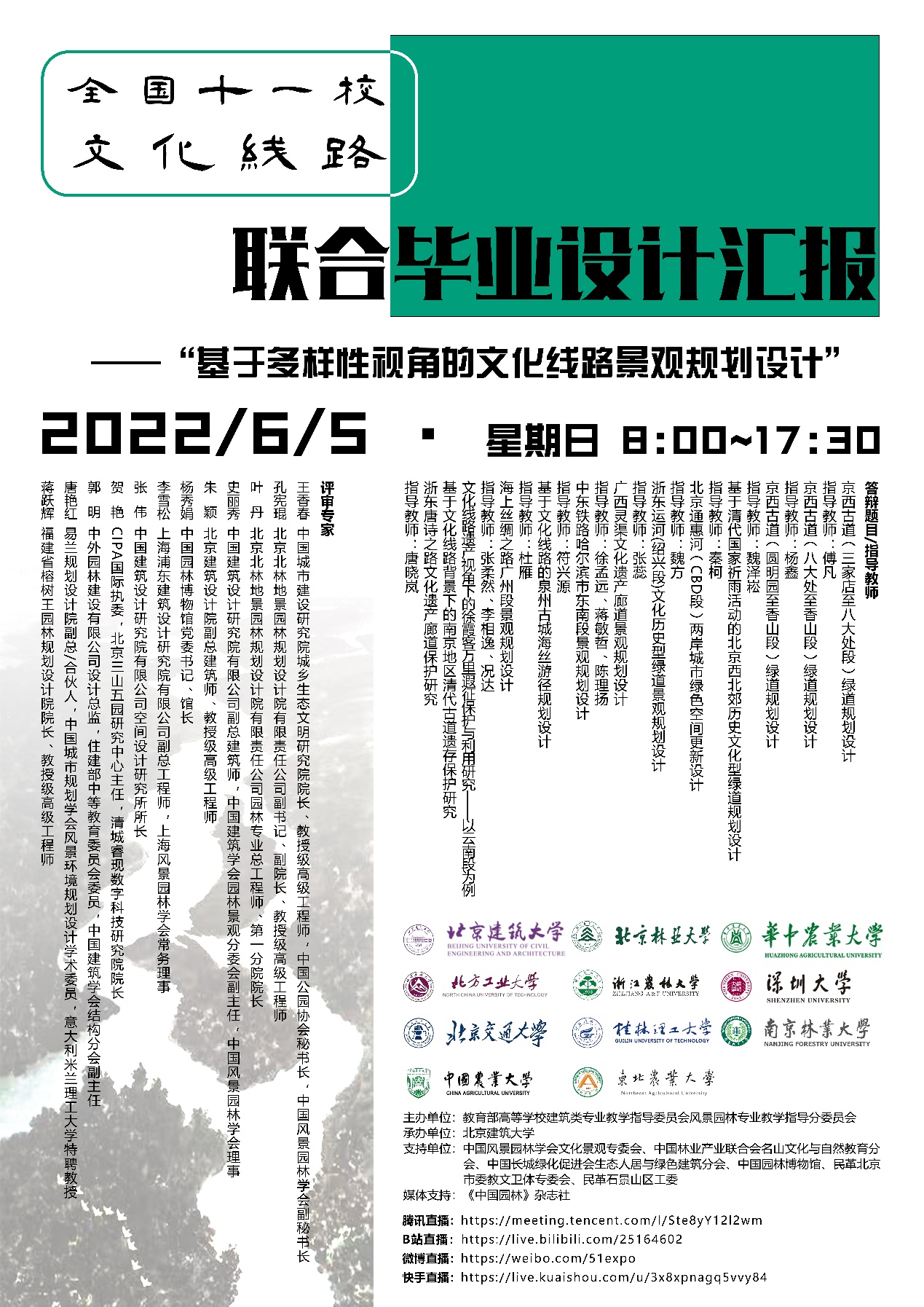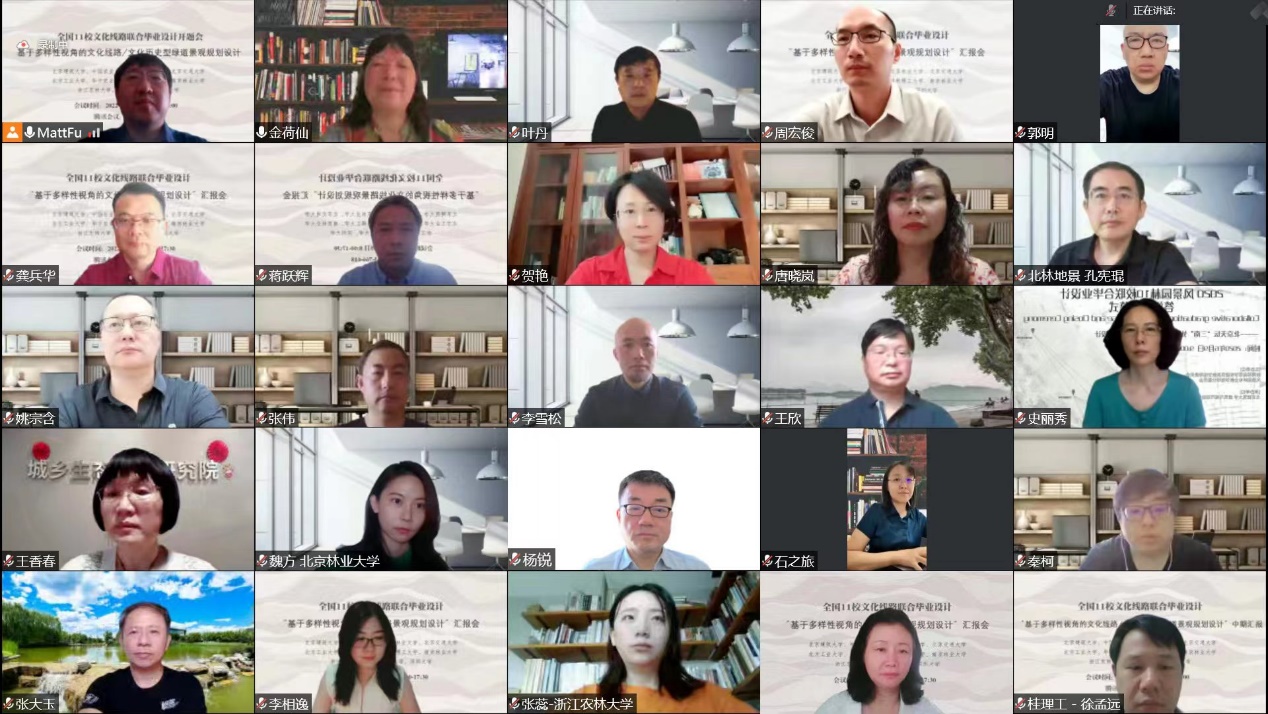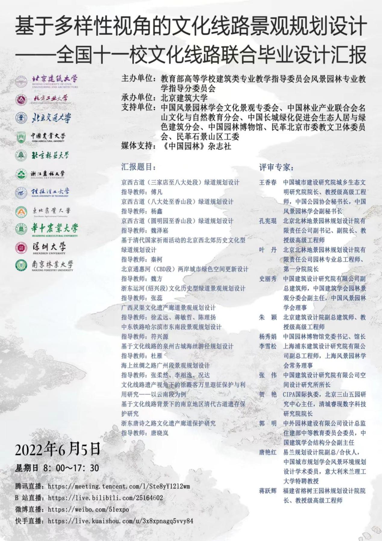 2022年6月5日,由教育部高等公司建筑类专业教学指导委员会风景园林专业教学指导分委员会主办,beats365官方网站承办,beats365官方网站、中国农业大学、北京林业大学、北京交通大学、北方工业大学、华中农业大学、桂林理工大学、南京林业大学、浙江农林大学、东北农业大学、深圳大学等11所高校参加的“基于多样性视角的文化线路景观规划设计——全国11校文化线路联合毕业设计“汇报会顺利举行,来自全国11所高校的师生与会议嘉宾、评委92人相聚云端,通过腾讯会议参加了汇报会,近80万人次通过B站、微博、快手、视频号等平台观看了汇报。本次活动得到了中国风景园林学会文化景观专委会、中国林业产业联合会名山文化与自然教育分会、中国长城绿化促进会生态人居与绿色建筑分会、中国园林博物馆、民革北京市委教文卫体专委会、民革石景山区工委等单位的支持,并由《中国园林》杂志社作为媒体支持。