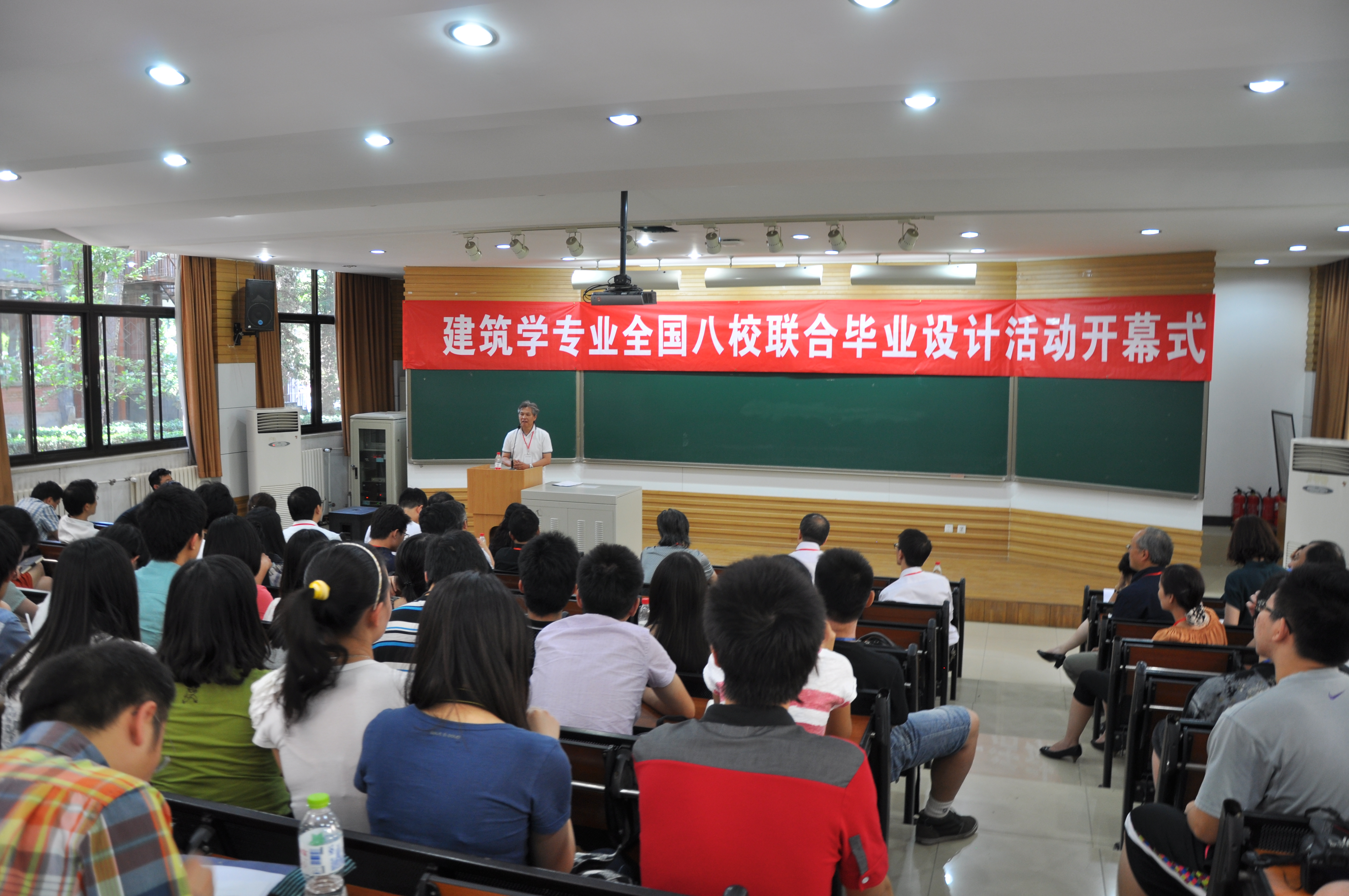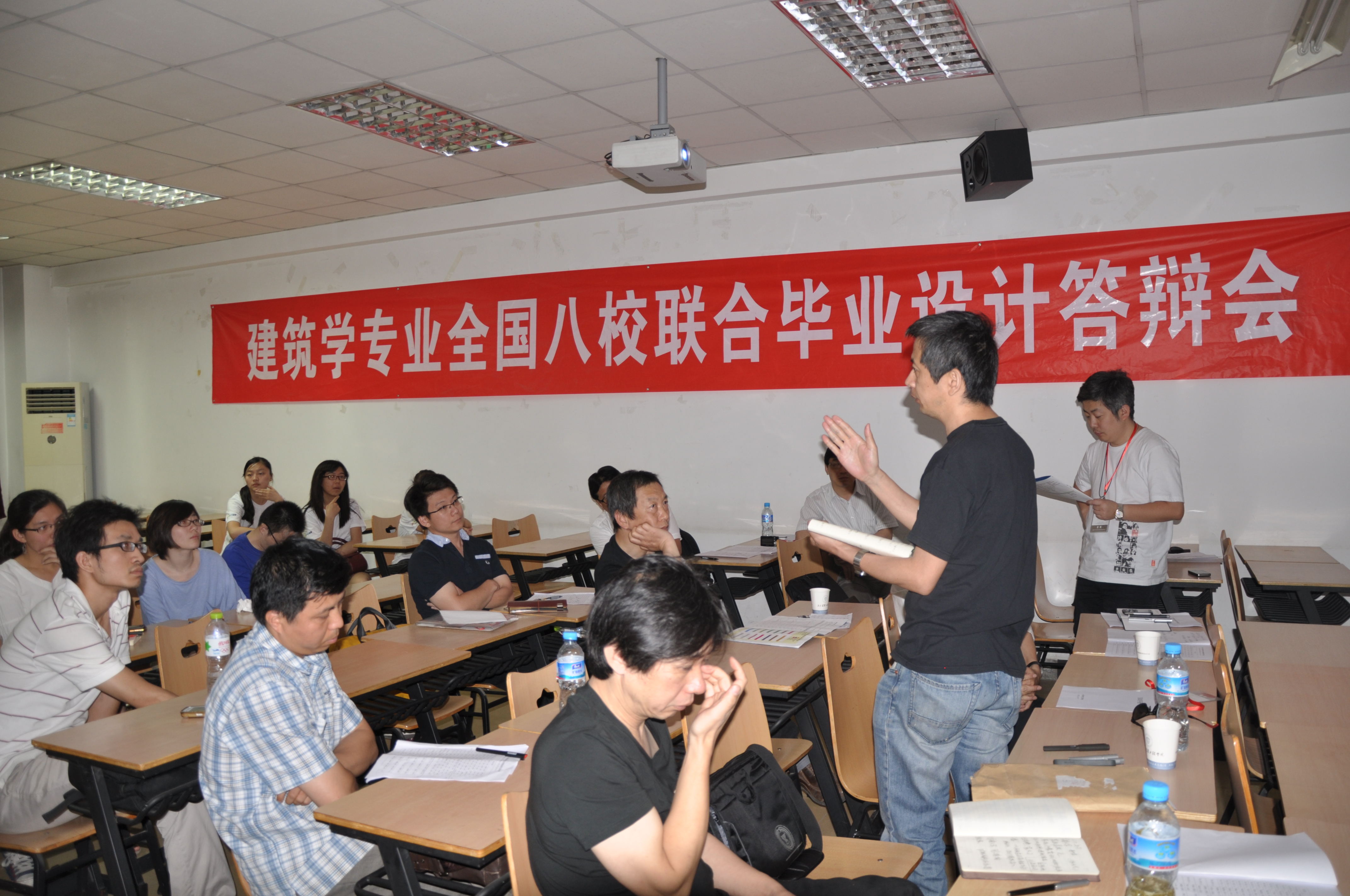 建筑学专业八校联合毕业设计活动是各校毕业设计指导教师联合发起的大规模、连续性教学实验与交流活动,自2007年始办以来,就得到了全国建筑学专业指导委员会的支持。多所院校积极响应、踊跃参与,活动规模不断扩大,活动模式日益成熟。从开始的6校,发展至今已达8校。每届参与师生已超过百人。该活动由各校轮流主办,选题紧密结合主办地热点现实问题和地域文化特征,经过现场调研、中期交流、最终答辩等三个环节的交流,达到教学资源、教学效益共享的目的。前五次活动依次在北京、上海、天津、南京、重庆主办,本次活动为第六次,由浙江大学主办,选题地点在杭州,题目是“从西湖到西溪——杭州新西泠印社建筑设计(八校联合)”,收到作品104件,在公司老员工活动中心进行了作品展示。终期答辩由公司承办。