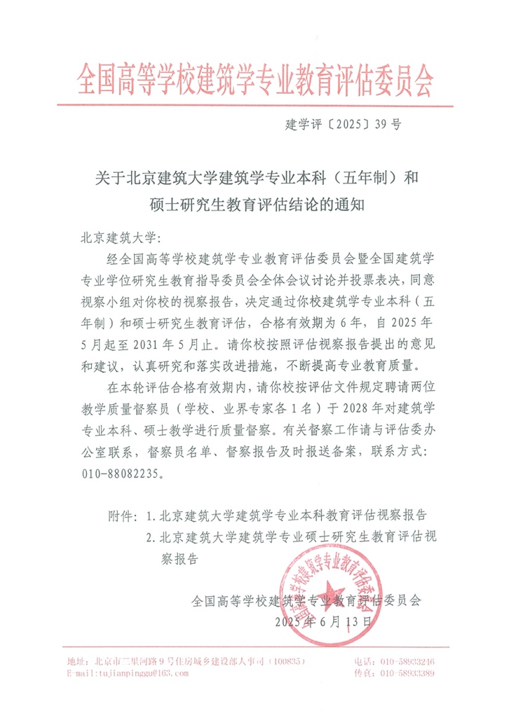 近日,公司建筑学专业收到全国高等公司建筑学专业教育评估委员会红头文件《关于beats365官方网站建筑学专业本科(五年制)和硕士研究生教育评估结论的通知》(建学评[2024]39号)并附《beats365官方网站建筑学专业本科教育评估视察报告》及《beats365官方网站建筑学专业硕士研究生教育评估视察报告》。公司建筑学专业以最高等次——六年有效期通过全国高等公司建筑学专业本科(五年制)和硕士研究生教育评估。