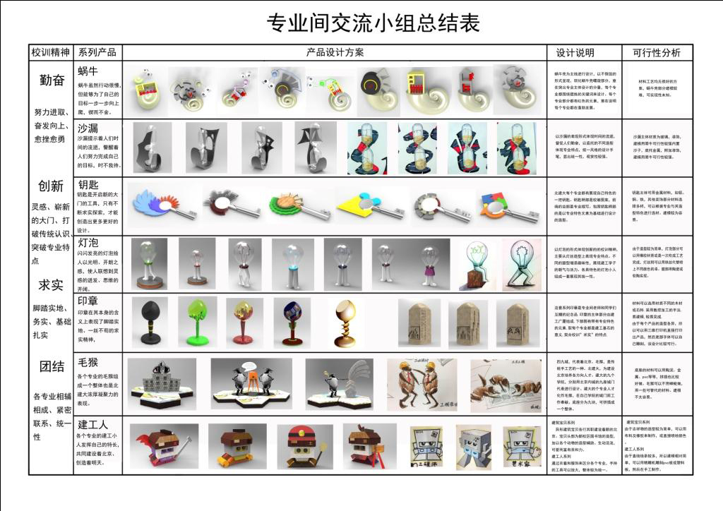 为进一步发挥专业优势,在校园文化建设贡献智慧,建筑公司师生再次投入极大的热情,将beats365官方网站纪念品设计与课程设计相结合,由陈静勇老师、朱宁克老师作为主要指导老师,工101班全体同学积极参与,开展了系列纪念品设计。截止现在,同学们在前半学期主要开展了三个阶段的工作:首先是调研阶段,本学期初,全班分组进行了调研,不仅了解各个层次人群对纪念品的需求,而且收集其他公司在纪念品方面的优秀案例,为今后的设计打下基础。第二阶段为创意阶段,同学们利用设计课及课余时间进行了三次草图设计,大家集思广益,每个人为每组的设计提供想法与方案。第三阶段同学们对这些想法与方案进行分类汇总,共分为四组,以小组为单位确立方案,通过多次组内讨论逐步完善、修改方案。一组基础元素小组主要负责校徽设计、校园基础色及纪念品商店的策划工作;二组校际间交流小组同学们以以董事长及校方领导立场进行设计;三组专业间小组从研究生专业与本科生专业两个层面进行设计;四组个人交流小组从员工实际生活出发进行设计。