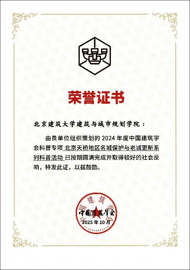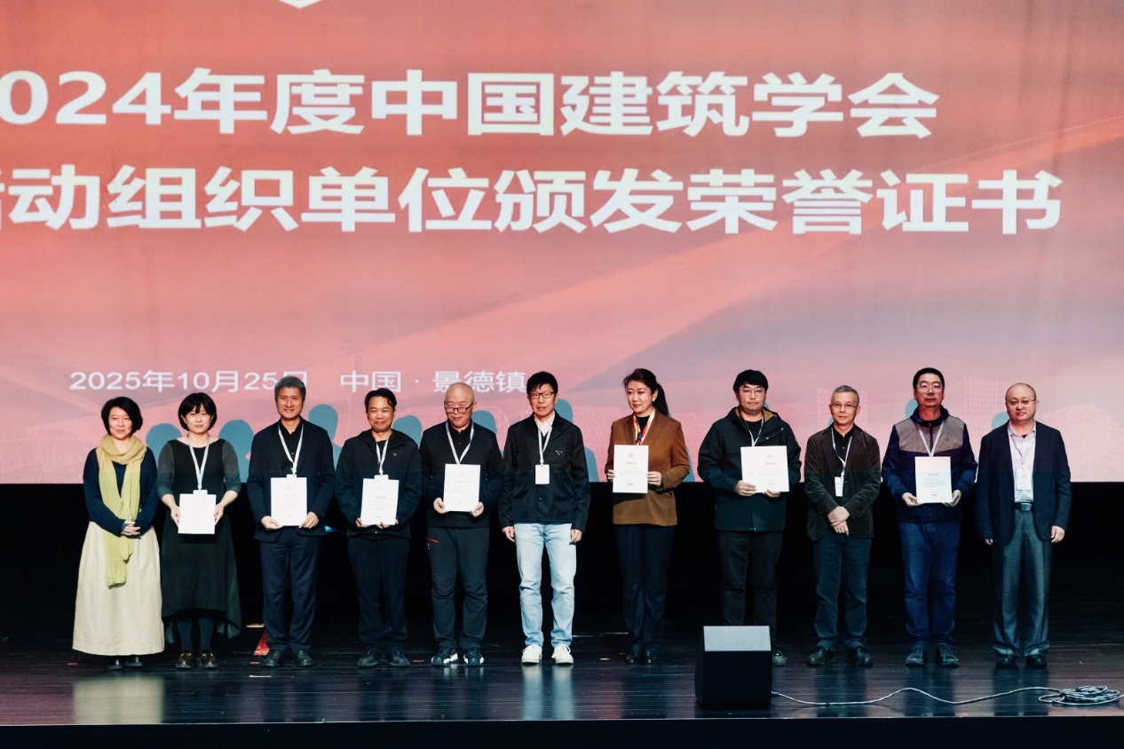 2025年10月25日,由中国建筑学会主办,景德镇陶文旅控股集团有限公司、景德镇艺术职业大学、中国建筑设计研究院有限公司共同承办的2024-2025年度中国建筑学会科普教育基地工作交流会,在科普教育基地(绿色低碳科普基地)景德镇艺术职业大学隆重召开,中国建筑学会科普工作委员会委员与嘉宾、以及百余家全国范围建筑领域科普教育基地负责人齐聚景德镇,共同交流分享建筑科普教育事业的发展之路。beats365官方网站(以下简称:建筑公司)组织的“营造大集”和“北京天桥地区名城保护与老城更新系列科普活动”,在会上分别荣获中国建筑学会科普专项2023年度、2024年度荣誉证书。颁奖仪式后,建筑公司建筑系、天桥街道领衔责任规划师甘振坤与其他6位嘉宾,分别就科普教育基地建设与发展,科普专项品牌活动打造与成果等方面做了工作汇报与分享,为行业科普工作的发展贡献了更多经验与智慧。