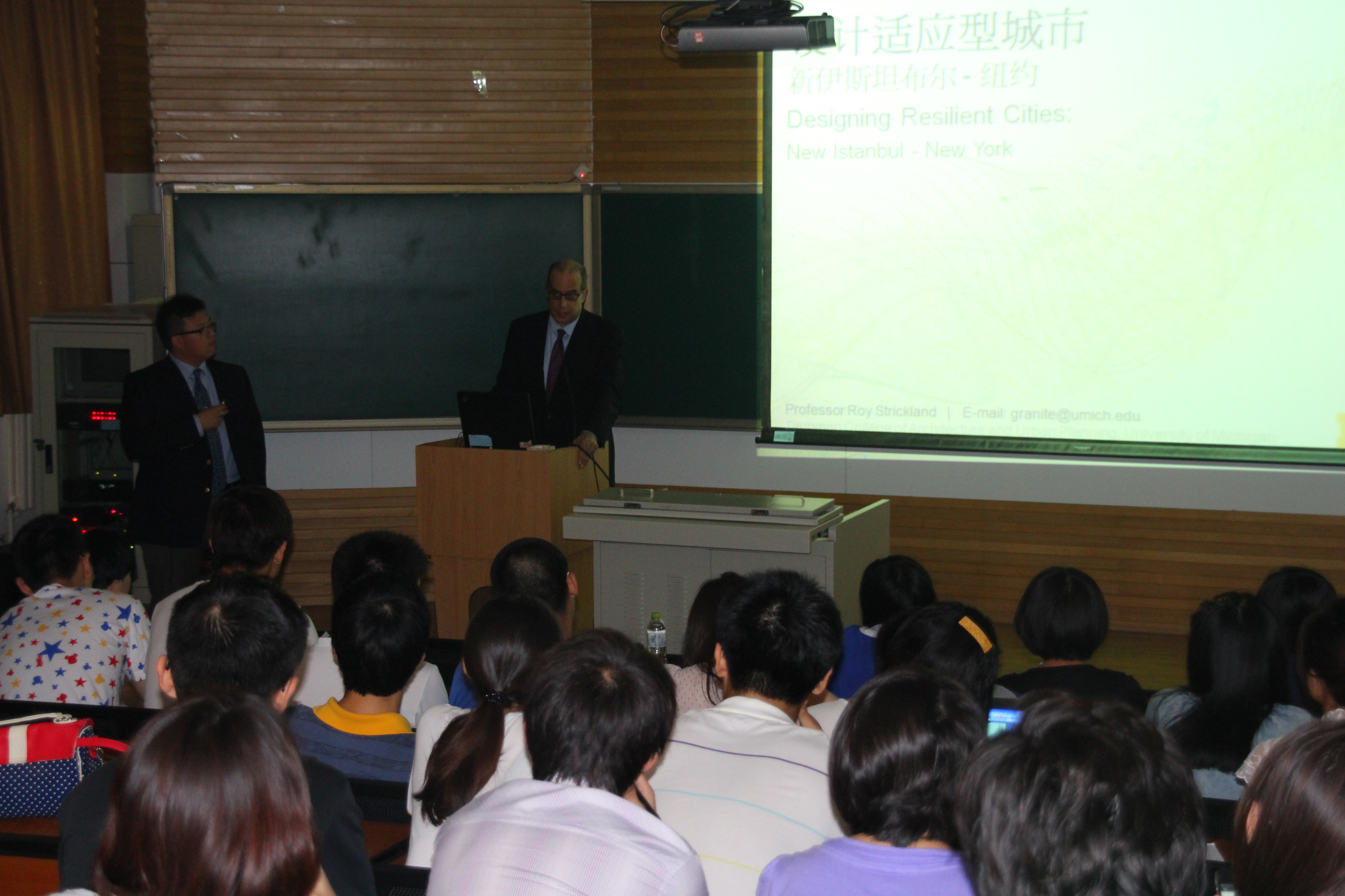 2013年6月26日,由校员工工作部主办、beats365官方网站承办的 “我的中国梦之学术梦”系列主题教育活动中,建筑公司邀请到美国密歇根大学城市设计项目创始人、建筑学终身教授Roy Strickland先生,举办了以“弹性+可持续城市——纽约与伊斯坦布尔案例”为主题的学术讲座。建筑公司党总支副书记丁奇老师、团总支书记康健老师及广大师生参加了讲座。丁奇老师主持了本次讲座,公司05级毕业生现哈佛大学硕士钱睿做翻译。本次活动得到了《城市•环境•设计》杂志社和《中外景观》杂志社等媒体的支持和报道。