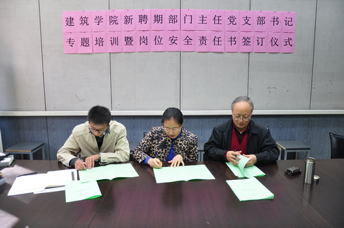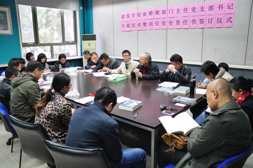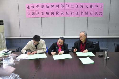 2013年10月29日中午,建筑公司召开由新聘期系(部、中心、室)主任、副主任教工党支部书记及科级岗人员等参加的专题培训会,并在会上签订了新聘期“安全稳定责任书”,公司党政班子全体成员参加会议并发言。