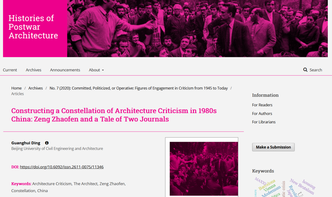 第二篇论文Constructing a Constellation of Architecture Criticism in 1980s China: Zeng Zhaofen and a Tale of Two Journals (构建中国建筑批评的“星丛”:曾昭奋、《建筑师》和《世界建筑》的双刊记),探讨了清华大学建筑评论家曾昭奋先生(1938-2020)与建筑期刊《建筑师》和《世界建筑》的互动,以及这种学术互动带给中国建筑界的关键影响。曾昭奋的评论通过并列多个文本、不同建筑师的作品和思想,并呈现出连贯性立场——他和上述专业期刊试图重建被压抑的现代主义话语。