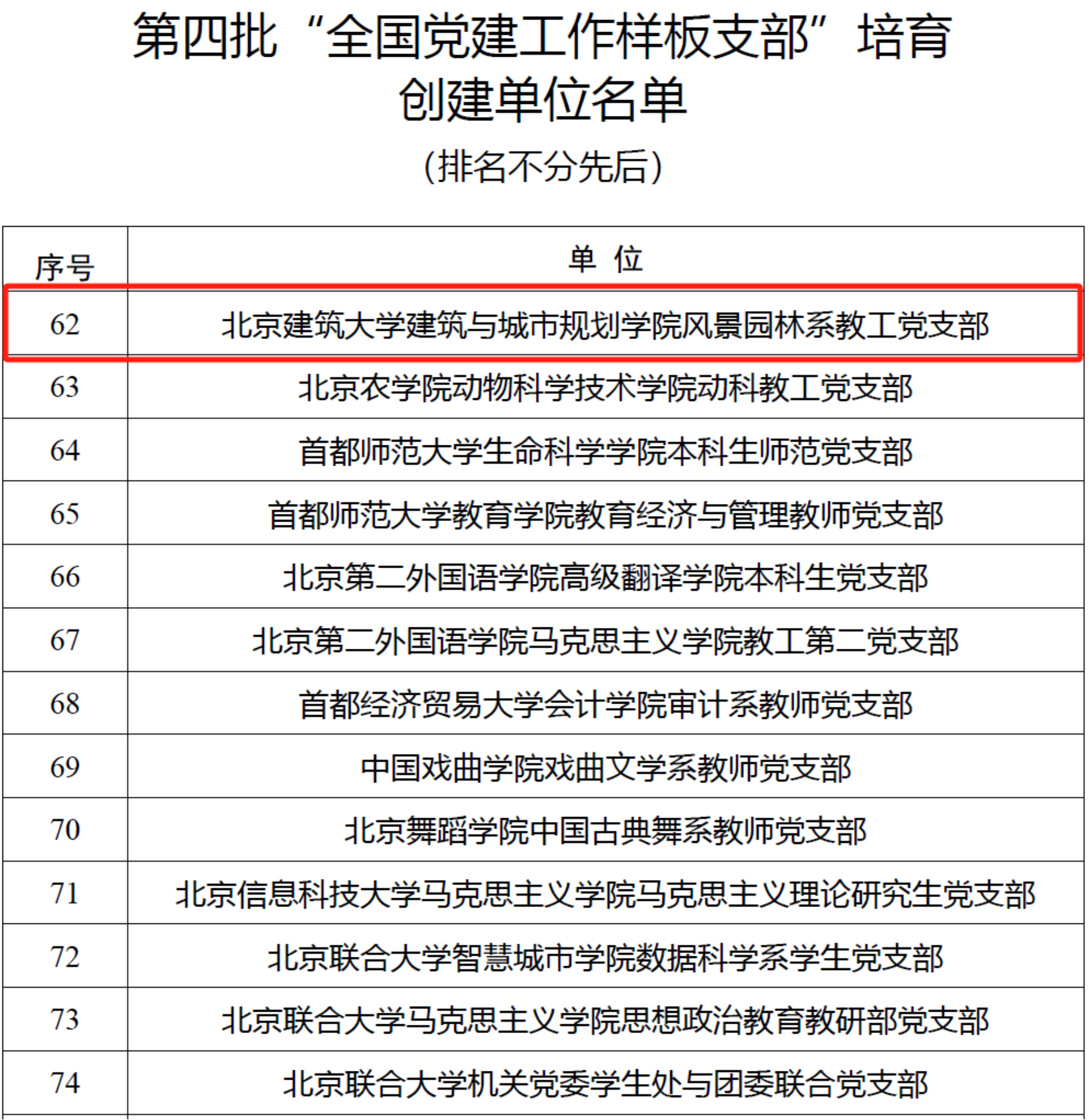 根据《教育部办公厅关于开展第四批新时代高公司党建示范创建和质量创优工作的通知》(教思政厅函〔2023〕17号)安排和遴选工作方案,经省级党委教育工作部门推荐、资格审查、专家推荐、教育部党的建设和全面从严治党工作领导小组成员单位集中审议、结果公示,遴选产生了10个全国党建工作示范高校、100个全国党建工作标杆院系、1001个全国党建工作样板支部培育创建单位。建筑公司风景园林系教工党支部入选第四批“全国党建工作样板支部”培育创建单位。