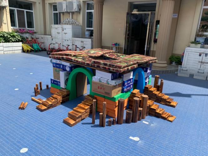 在实体搭建班上,幼儿园冯晓童老师和同学们带领小朋友使用废弃纸箱、泡沫积木、海绵垫等回收材料,在操场上搭建了一座3米见方、可居可游的四拱门小屋。“重的材料堆下面、轻的材料搭上边”,“我要住在这里”,孩子们展现出火热的搭建兴趣,充满了以及对自己作品的喜爱。随后,同学们来到楼道中,使用万能随变工匠和木积木,与小朋友们共同创作了大家心中的幼儿园。