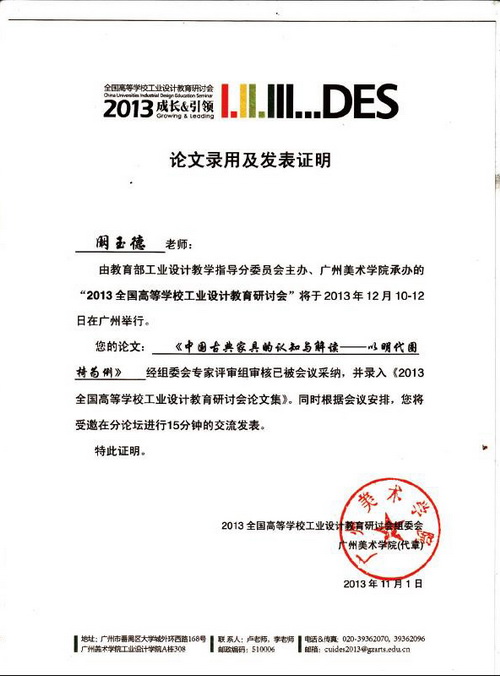 公司建筑公司教师阚玉德的论文《中国古典家具的认知与解读-以明代圈椅为例》获得宣讲论文。在12日上午的论文交流会上进行了15分钟的汇报演讲,与现场人员进行了研讨。