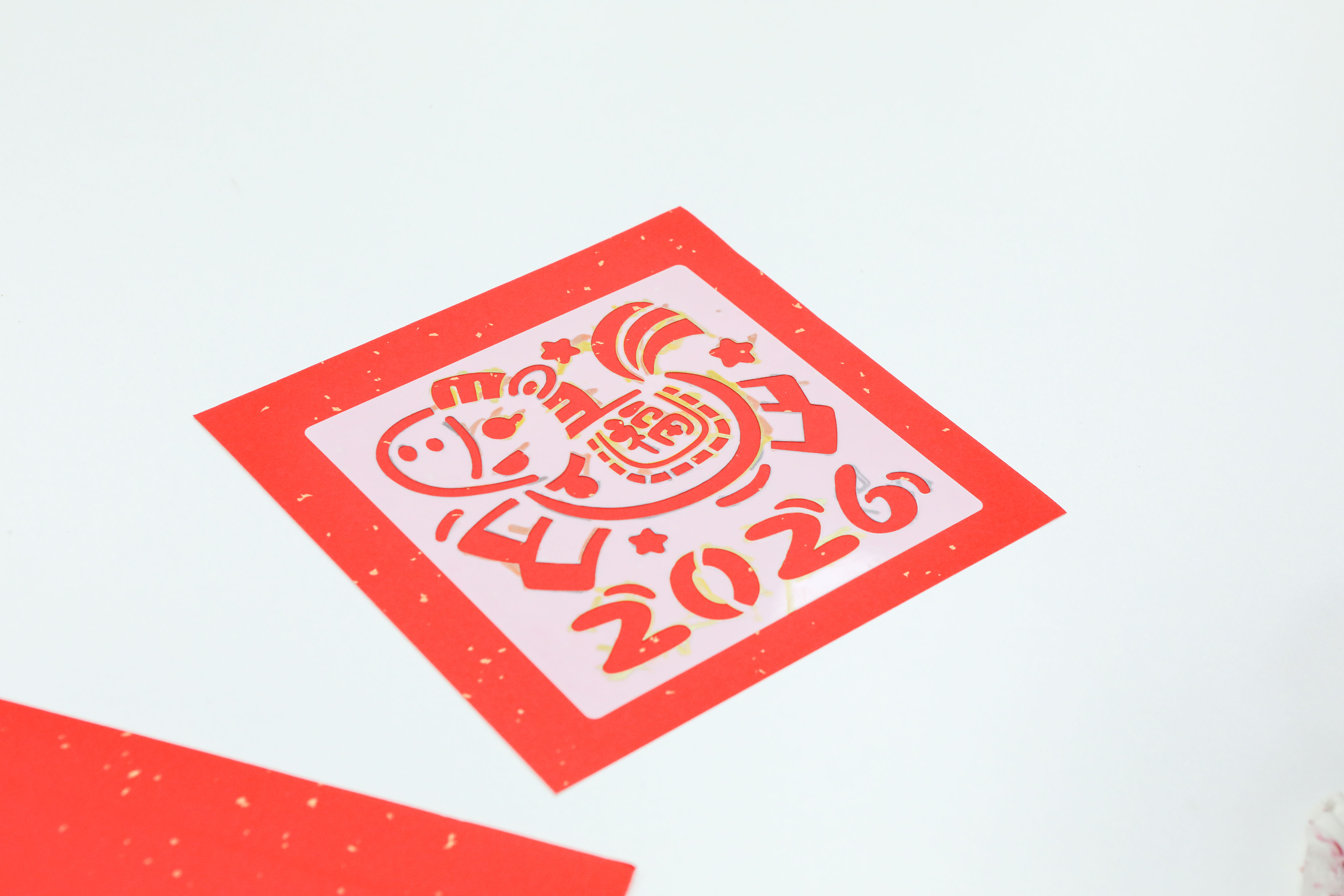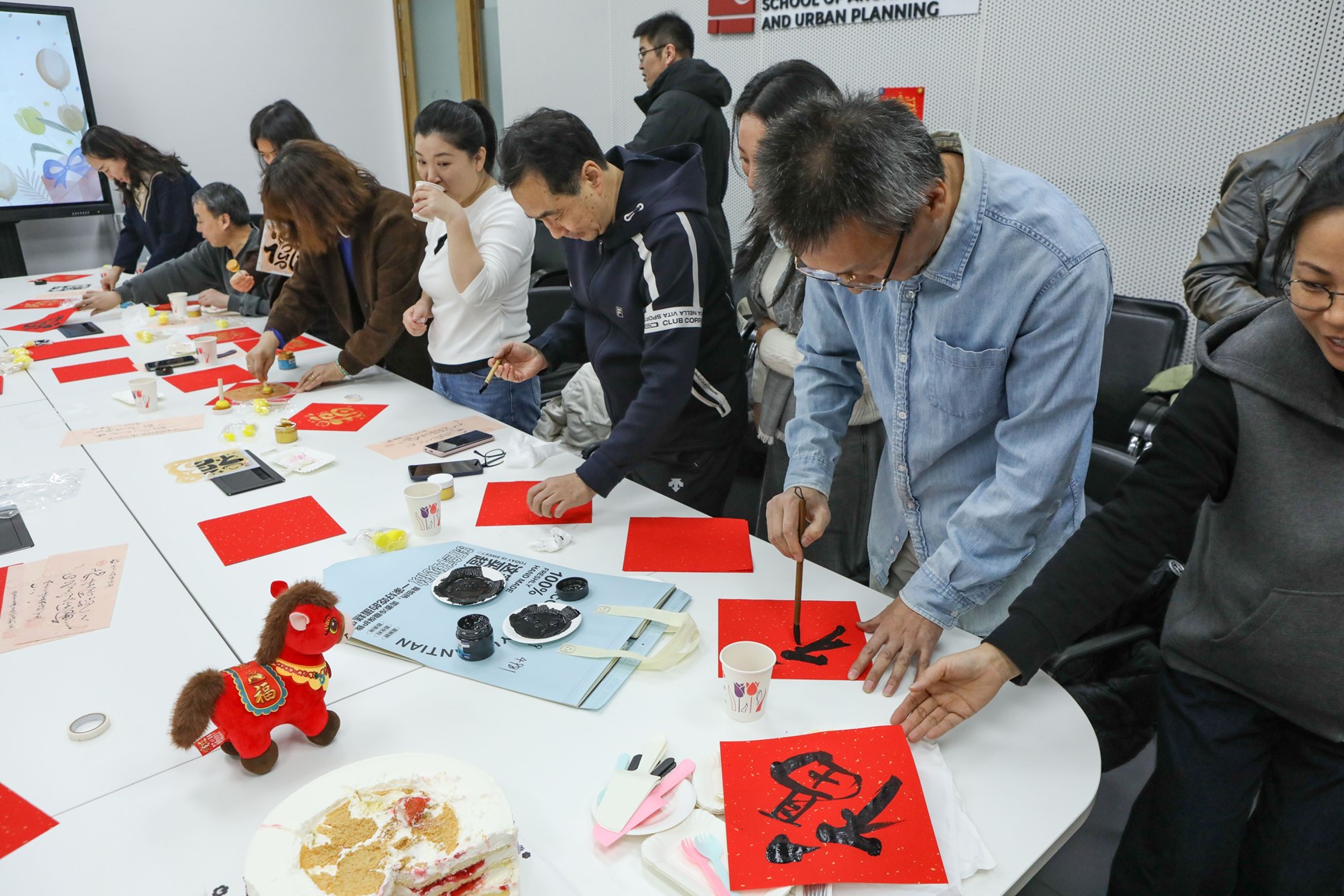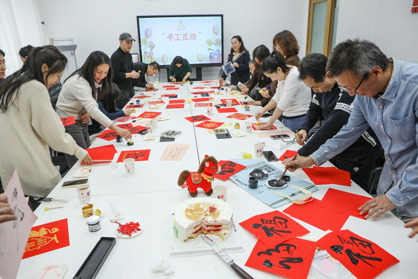 活动尾声的新年拓印画福字环节,将温馨氛围推向高潮。现场摆放着刻有“福”字、马年卡通形象及“柿柿如意”等吉祥纹样的拓版,寿星们手持拓包轻轻拍打,一张张朱红饱满的福字跃然纸上。大家相互展示自己的作品,将对新年的期许与对同窗的祝福融入这一传统技艺之中,让非遗文化的魅力在青春的互动中得以传承。