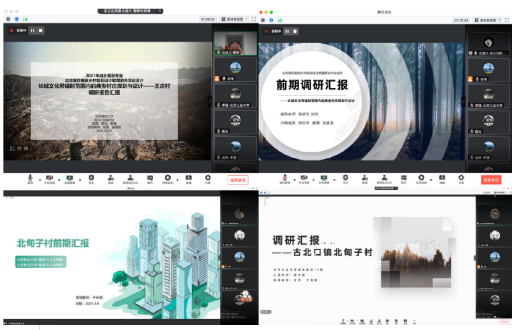 接着,四所大学的同学依次对当前的调研成果进行了汇报交流。老师们对大家当前的工作成果予以了肯定,各校指导老师也分别对调研的内容、方向、细节给出了优化建议。最后,四所京内高校教师商定了本次毕业设计中期检查等环节的时间节点以及后续邀请行业专家举行讲座等下一步的工作计划。期待此次北京高校美丽乡村规划设计联盟联合毕业设计接下来的各个环节顺利进行,本次会议展示出各校的教学特色,对校际教学改革、交流合作与质量提升具有重要作用。