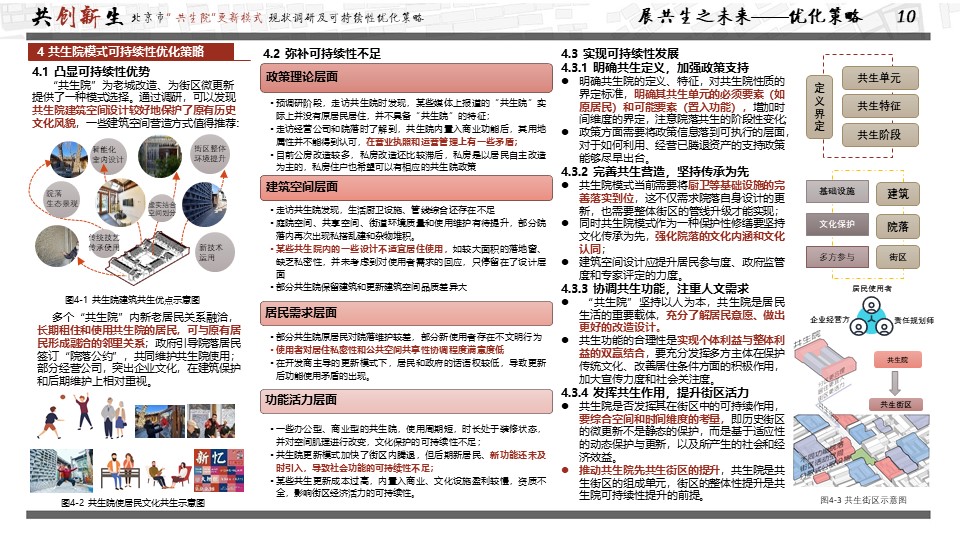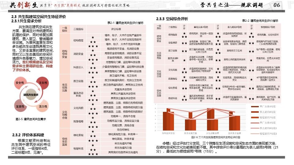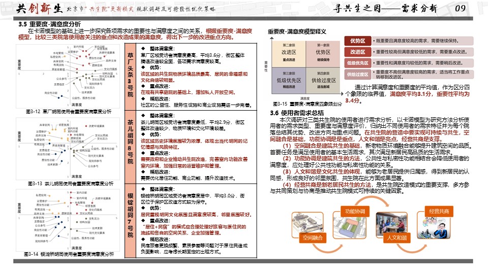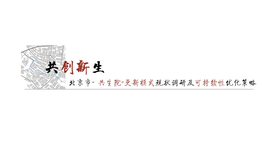 获奖作品聚焦首都城市更新问题,以可持续发展理念为研究视角,探究“共生院”与城市可持续发展的关系,并通过实地勘察、资料汇总、采访访谈对现有共生院院落的使用现状进行调研,并通过问卷调查、KANO模型分析等方法分析使用者需求、影响要素及现存问题,进而提出共生院可持续发展的优化策略,以期“共生院”模式更好发挥引领示范作用,实现可持续发展。