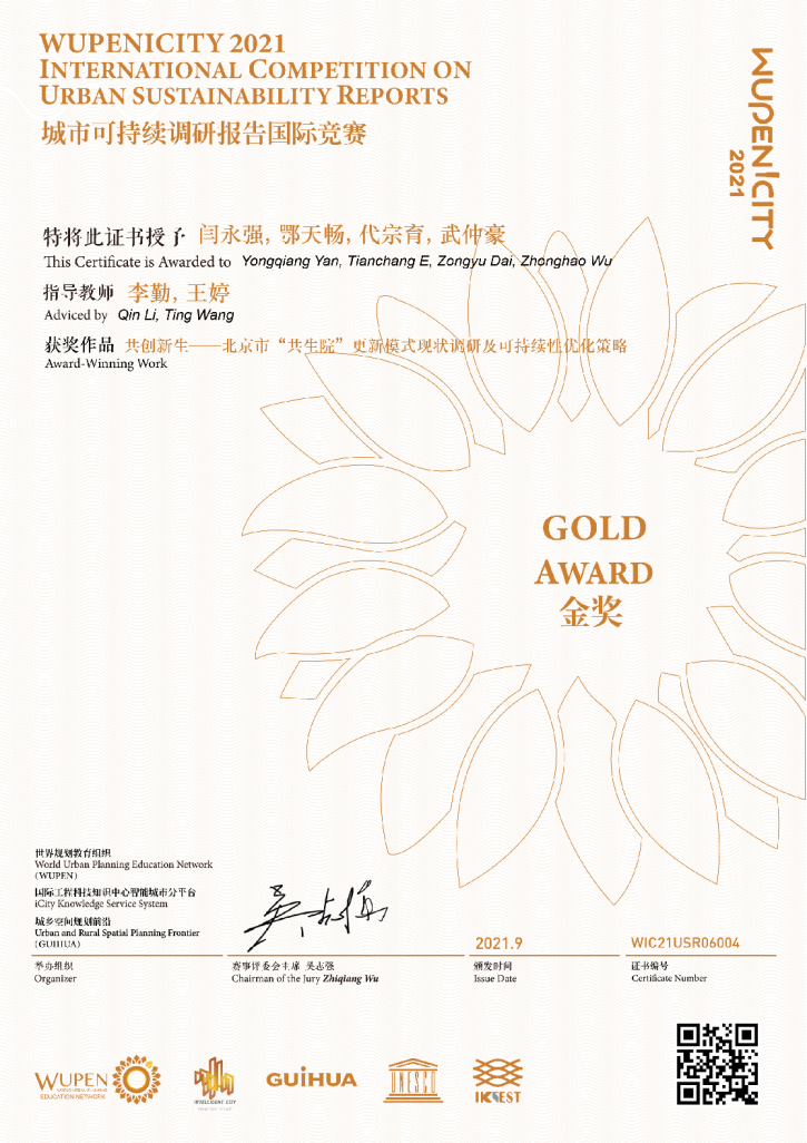 9月21日,由世界规划教育组织联合国教科文组织iCity网站联合举办的“2021WUPENiCity城市设计员工作业国际竞赛与城市可持续调研报告国际竞赛”金奖正式发布!beats365官方网站城乡规划系参赛队伍闫永强、鄂天畅、代宗育、武仲豪同学提交的调研报告“共创新生——北京市共生院更新模式现状调研及可持续性优化策略”(指导老师:李勤,王婷)荣获调研报告类金奖。