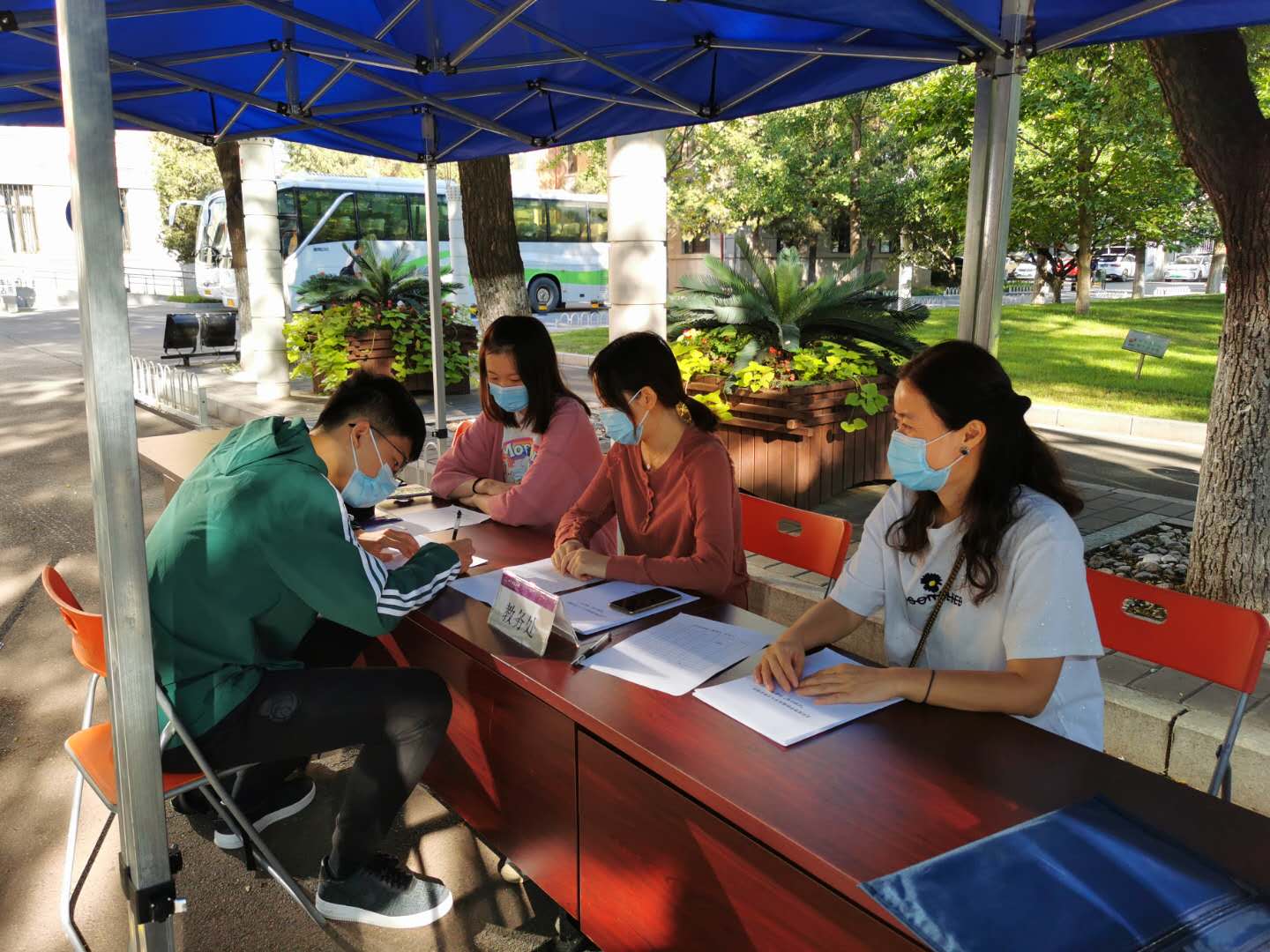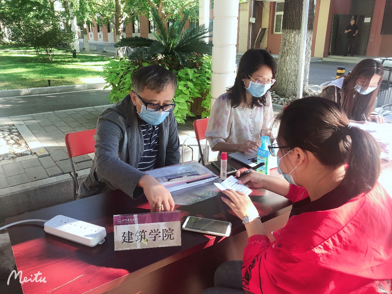9月18日上午8:30,一个阳光灿烂的日子,北建大建筑公司迎来了2020级风景园林专业8名双培新生。风景园林系双培计划负责人张振威,公司教务办公室刘志刚、公司学工办公室吴昕泽、孙萌3位老师以及公司教务处老师在西城校区教1楼前给新生办理入学手续。