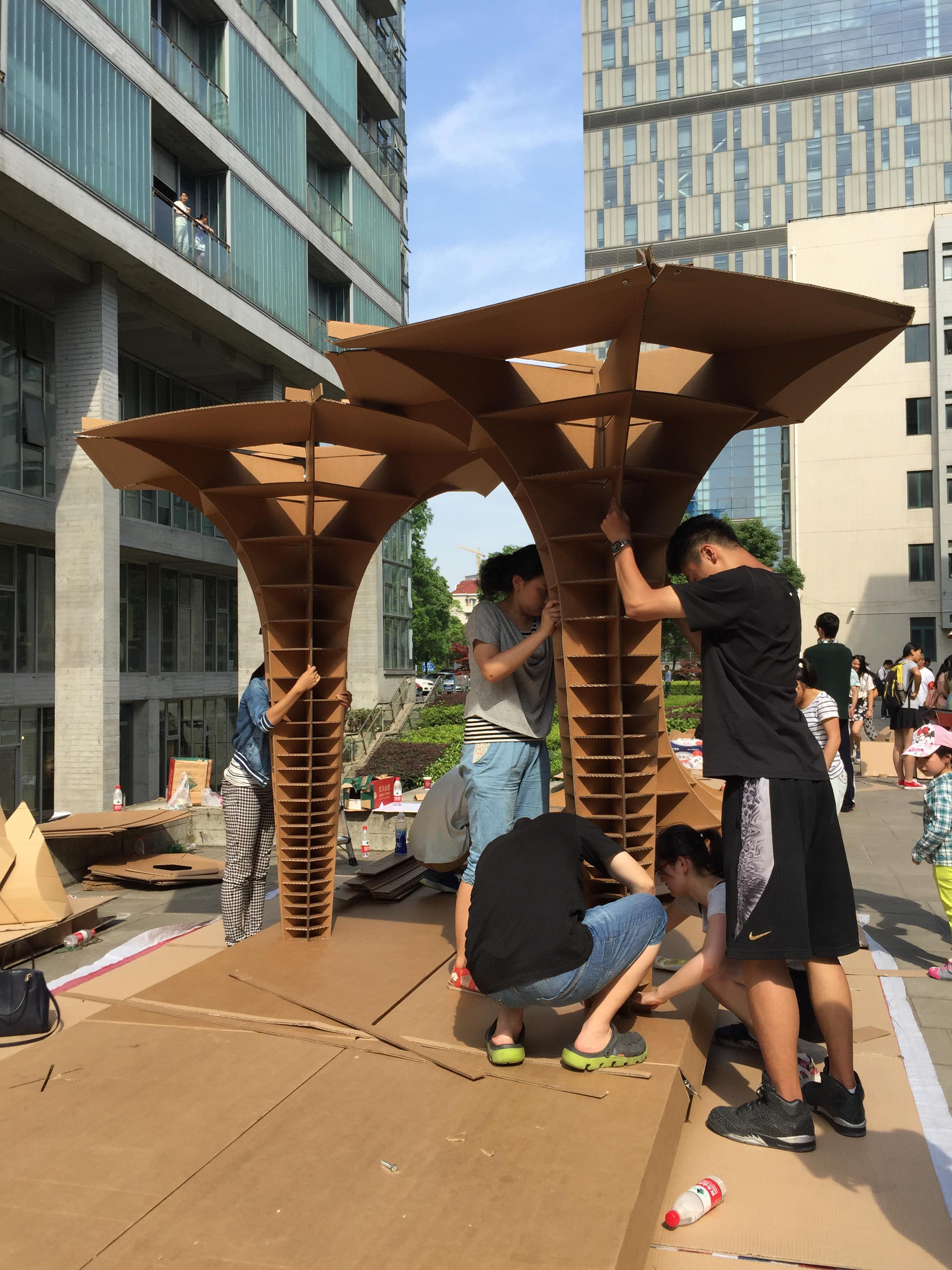 6日上午,简短的开幕式过后,各支参赛队伍马上开始了紧张、有序的实体建造工作。本次大赛所用到的建筑材料主要为五层瓦楞纸板、麻绳、螺丝、塑料布等,要求建造作品不仅要结构稳定,而且要满足通风和自然采光,体现结构和空间的美感,并满足站、坐尺度要求,以及晚上居住时的躺、卧尺度要求。建造的目的在于通过实践,让员工对建筑材料性能、建造方式及建造过程获得感性和理性认识,通过真实的体验把握建筑最基本的要素。