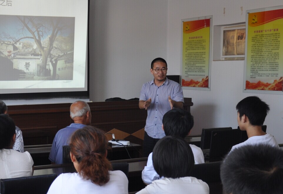 8月2日上午志愿者服务团全体成员来到北庄堡村村民活动室为村民开设“乡土学堂”,结合当地村落的实际情况,向村子里的留守村民讲授传统村落的历史渊源和文化内涵,怀安县委副书记刘斌、怀安县长助理徐强特意赶来参加,40多位村民冒着烈日赶到现场参加了本次活动,本次宣讲由志愿者代表赵博新主讲,建筑公司党委副书记丁奇主持了本次活动。