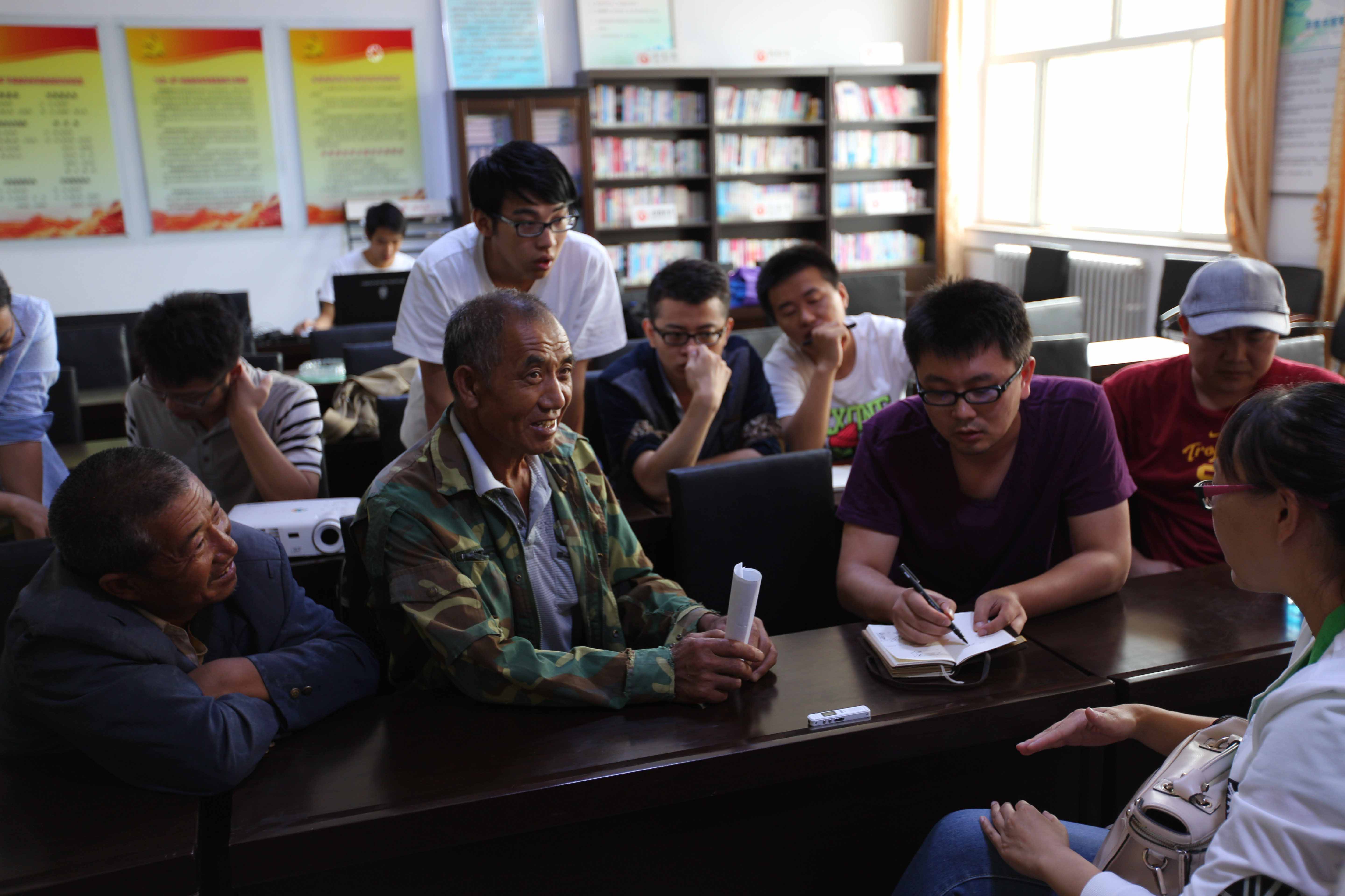 当地村民的淳朴和热情驱散了志愿者的劳累,在多方问询后,我们有幸找到了村子里两位经验丰富的碹窑工匠,两位工匠已过花甲之年,但提起碹窑的建造显得十分的兴奋,神采奕奕的给志愿者们进行讲解。为了解决方言造成的沟通障碍,村干部还专门找来村里的幼儿园教师充当翻译。志愿者们主要针对碹窑的施工环节、用料、材料配比等问题向两位工匠请教,两位老人边讲述村里碹窑的历史,边耐心的解答问题。为了更形象的沟通,志愿者们还在一些抽象的问题上,用图示的方式向两位工匠的进行询问,其中包括详细的尺寸大小,特殊位置的构造方法,防水、采光、保暖等问题。两位工匠对于图示,边画边解释认真地给大家做讲解,还时不时地在讲解中加入了生动的例子。访谈历时三个多小时,师生们认真的记满了厚厚一本的笔记。