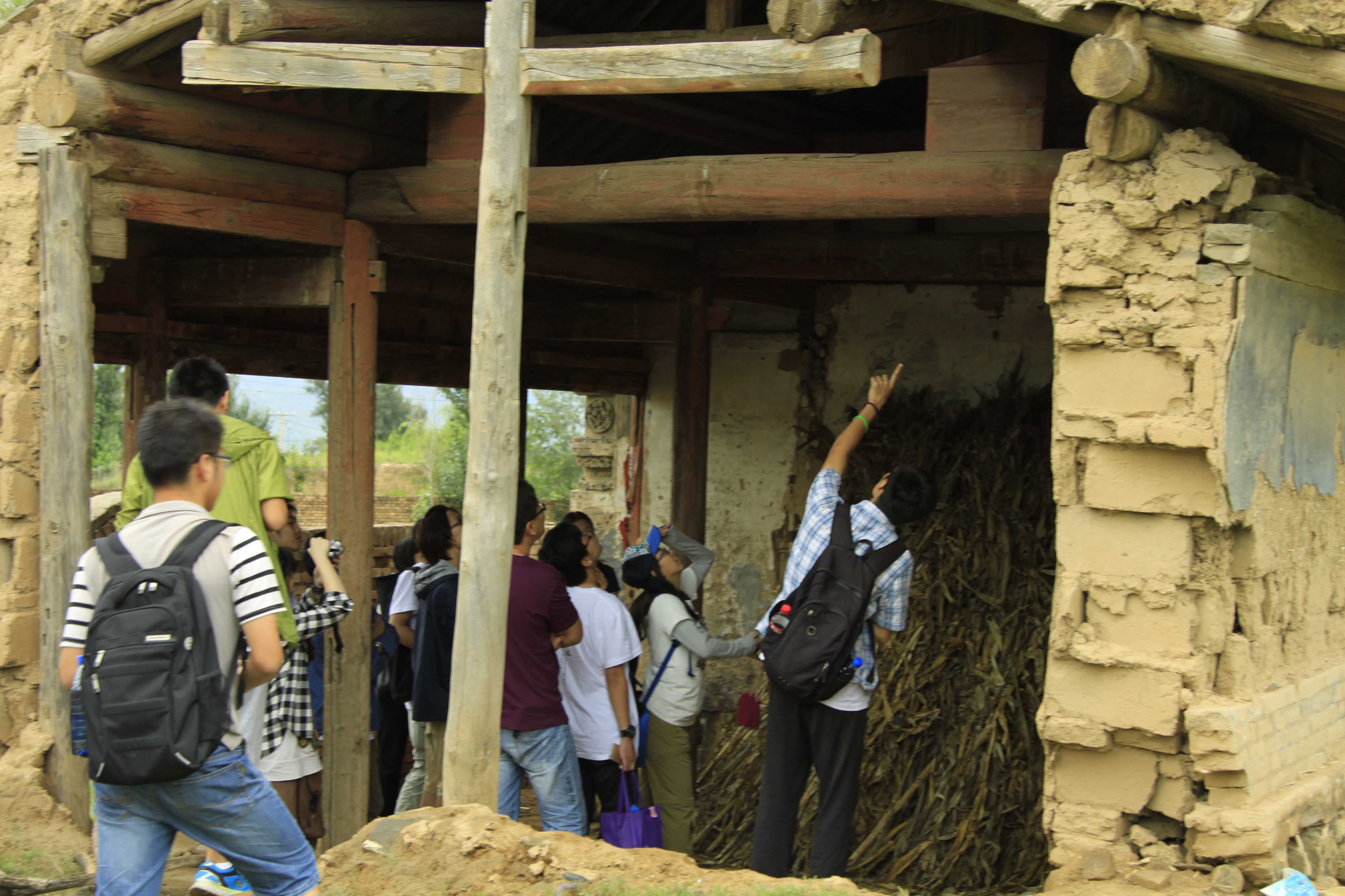 因为当地村子多建在沟壑两侧,交通颇为不便,为志愿者的调研造成了很大不便,师生们冒着炎炎烈日穿梭在乡间小道上,地面土质坚硬,走在上面嘎吱作响,随处可见用黄黏土搭砌的院墙,废弃的窑屋起伏错落的展现在眼前,有的只剩下断壁残垣,却矗立不倒,金色的阳光照射在土墙上,将一排排碹窑点染得明暗有致,显现出一种残缺荒凉的美。