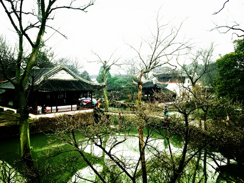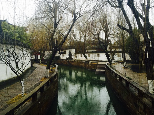 毫无疑问的是,一进拙政园就被这座“水中园”折服了。林木葱郁,水色迷茫,四围苍树环合河塘,成双成对的鸳鸯在水中嬉戏游水,池影倒现亭台楼阁,偶有冬鸟掠过,水镜潋滟,乌色灵闪,虚虚实实,如梦如幻,这样一来延伸了空间,给烟雨中的小楼平添一份神秘感,二来使原本静态的景物灵动地有了生命力。一池小塘,不枯翠荫,池广林茂,乍现小楼。在拙政园,自然景物与人文财富相间相生,浑然天成。